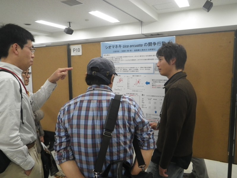 10月20、21日に日本甲殻類学会第50回大会が熊本大学で開催されました。今回の学会では、卒論のテーマである「シオマネキの闘争行動」という内容でポスター発表をしてきました。 初めての学会参加、初めての学会発表で少し緊張していましたが、来てくださった方々は熱心にお話を聞いて下さり、多くのアドバイスをして頂きました。熊本大学は学部時代に私が在籍していたところでもあり、前の研究室のメンバーと近況報告や研究の話で大いに盛り上がりました。