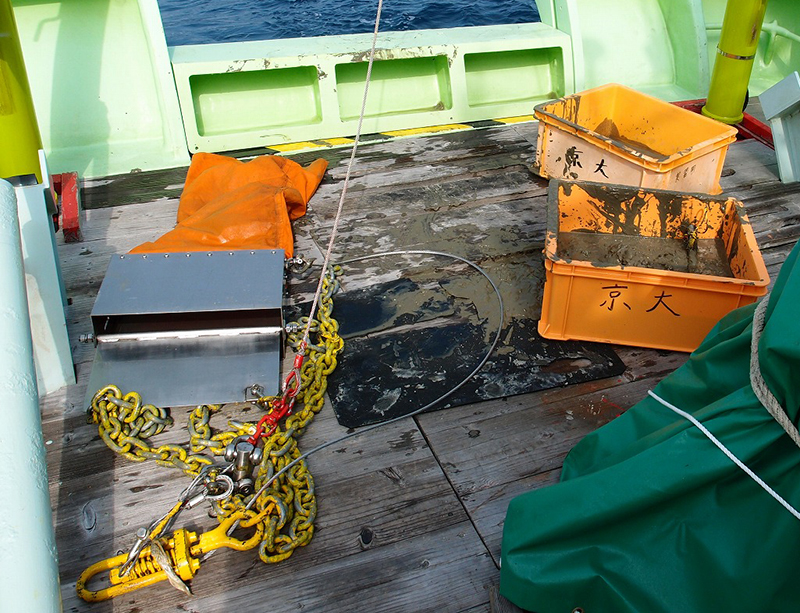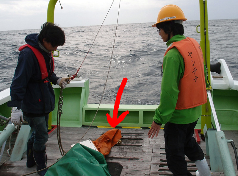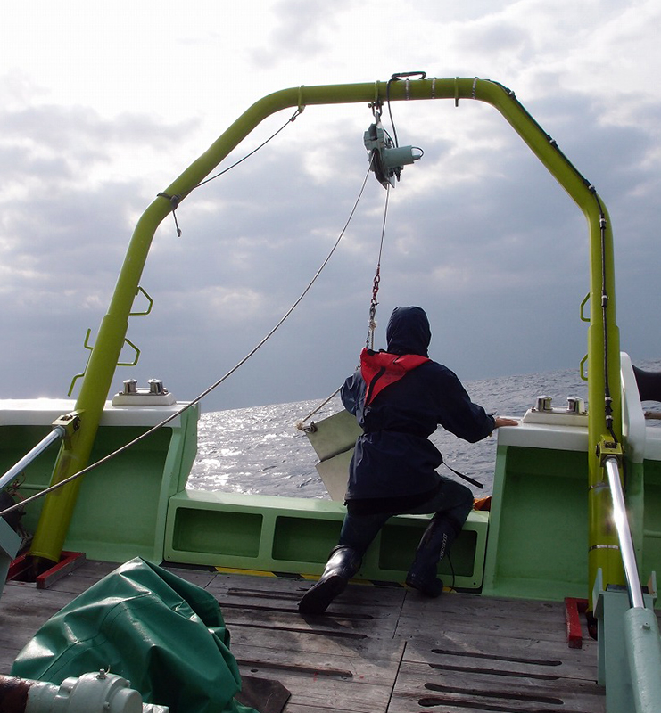 さっそく、砂泥採集に特化したドレッジ投入!(by 技官Kさん)