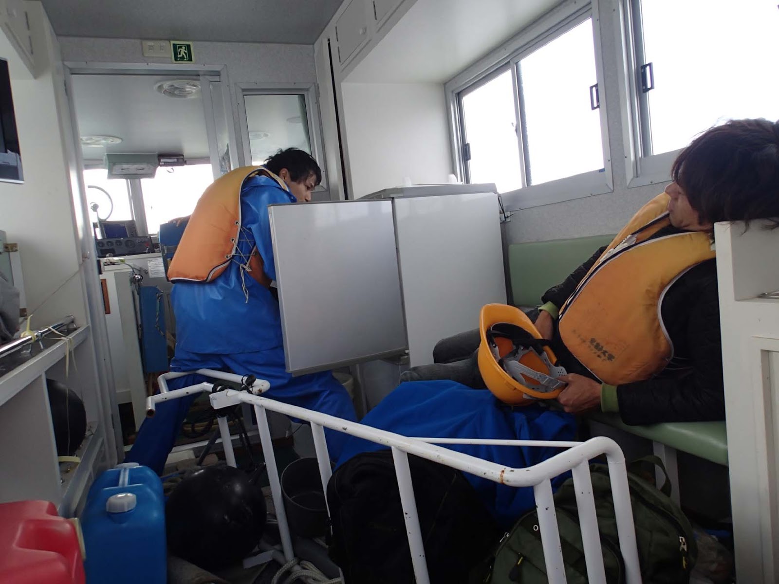 船内はぐちゃぐちゃに。こんな時に、岡西君は冷蔵庫を漁っています(笑)いえいえ、ちらかった冷蔵庫を直してくれているのです。手伝えなくてごめん。