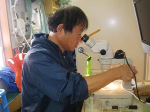このクラゲの生態は実はよくわかっていません。それを明らかにするための調査が毎年豊潮丸で行われており、わたしもこのクラゲの平衡石の形態を調べるために同行しました。