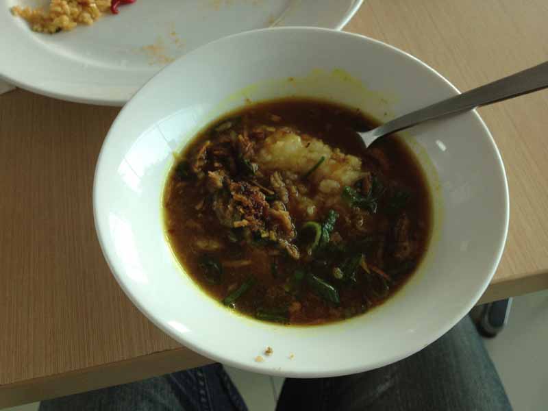 おかゆみたいな米に、ドライベジタブルみたいなものをのせて、カレーみたいなスープをかけた料理。