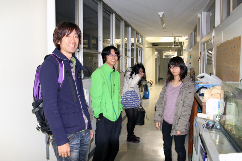 3日目は調査を終えてから、高知大学の伊谷先生のところへ遊びに行きました。伊谷さんは瀬戸臨海実験所のOBで、現在、私と一緒に共同研究も行っています。左から、私、ふじもん、くしゃみするあゆみさん、魚の話をすると目の色変わるへんみさんです。