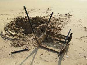 これは、おそらく数か月間砂浜に放置されていたため、砂に埋まってしまっていたコンロです。つまり、ここで火気を使っていたことを示しています。実は、夏に畠島を訪れたときはもっとひどい状況でした。コンロだけで同時に4台、バーベキュー用の炭、食べ残した野菜、それから壊れたテーブルやイスなども放置されていました。