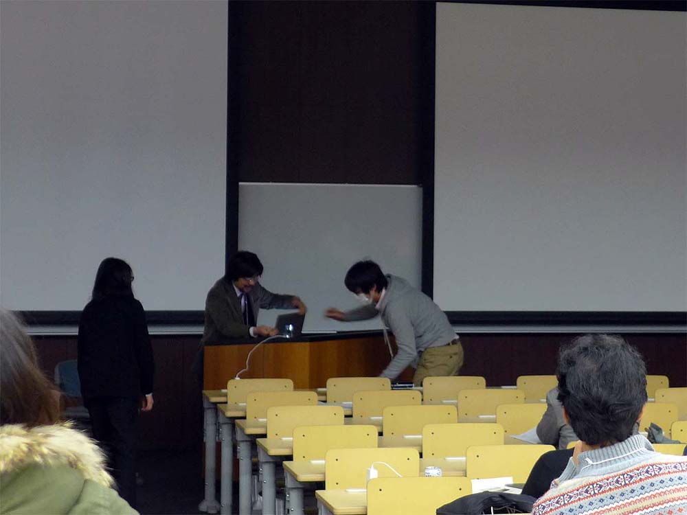 | と思ったら、プロジェクタを繋ぐコードに足を引っかけて、画面が消えてしまい、場内に失笑が…。 |