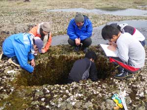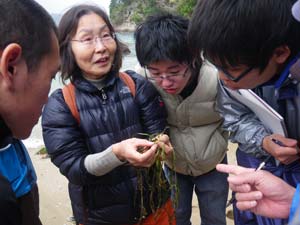 次はタイドプールの海藻の分布を調べる実習です。タイドプールの大きさ、深さ、海からの距離、方角、それから海藻食のウニ類の分布など、海藻分布には種ごとに様々な環境が関係しています。現場で同定作業を行い、それぞれの海藻の水平・鉛直分布を絵に描いて記録します。実験室に帰って、海藻の分布に環境の違いがどのように影響するかを考察して発表しました。
