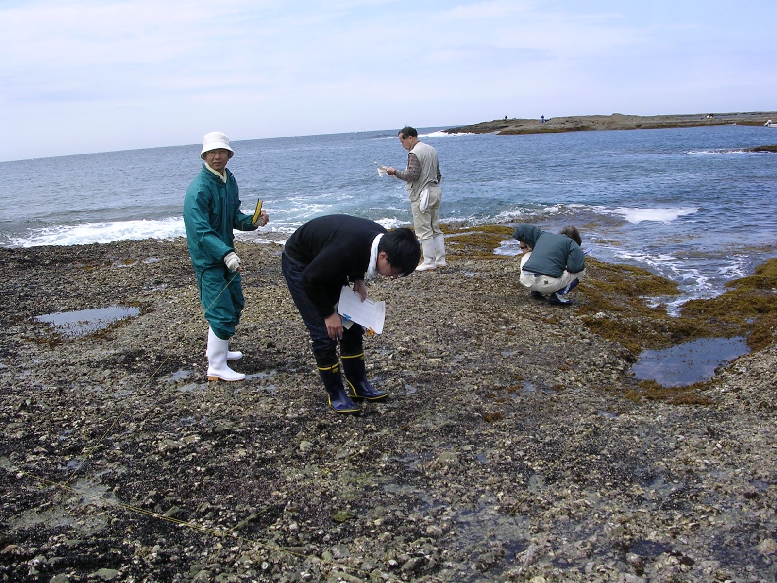 | ありし日の大垣さん(左)。岩礁潮間帯のマクロベントスの調査をチームで行っているところ |