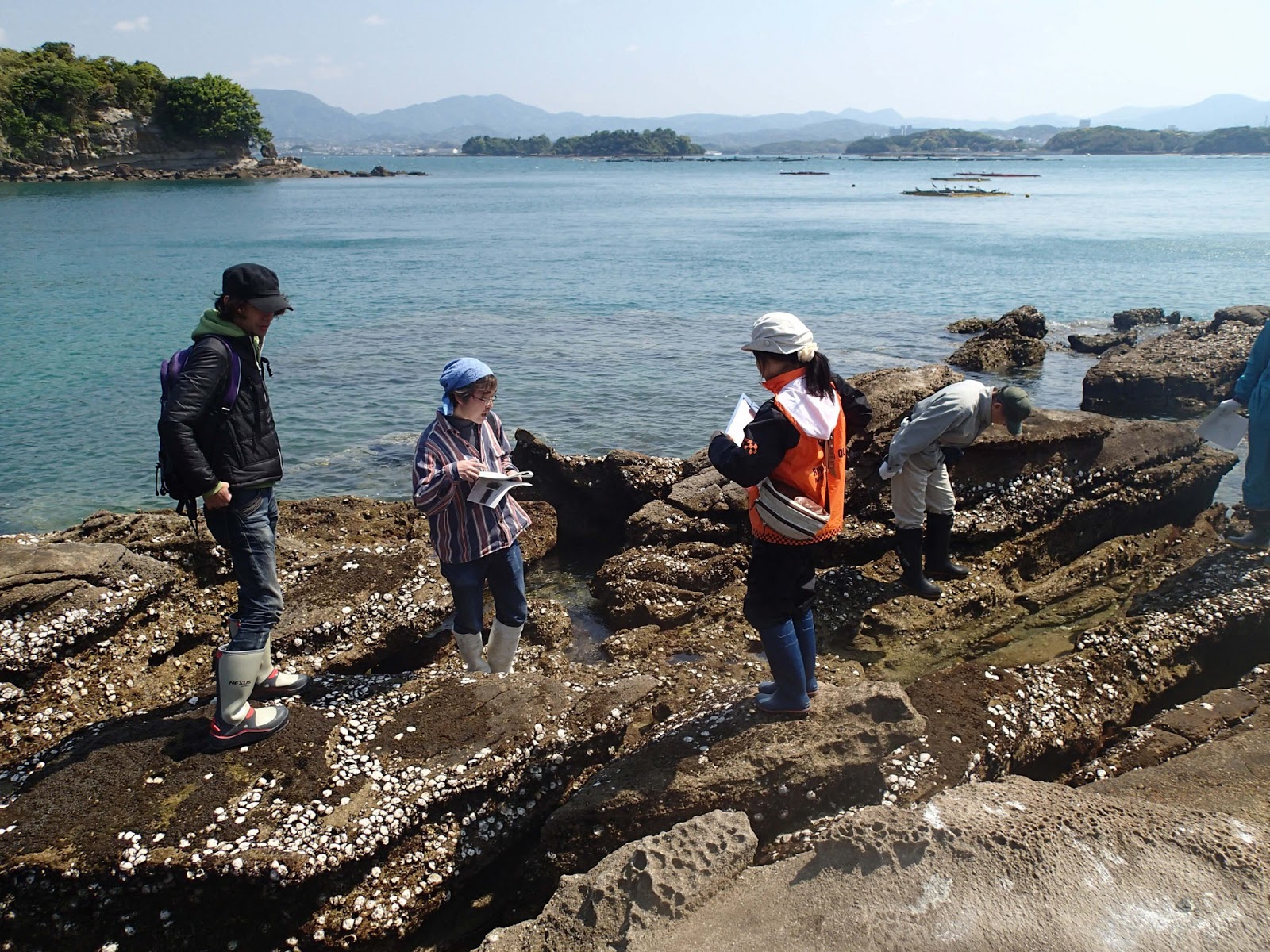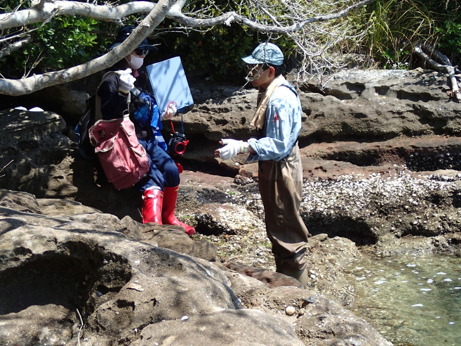 | 上陸して打ち合わせする軟体動物班。 |