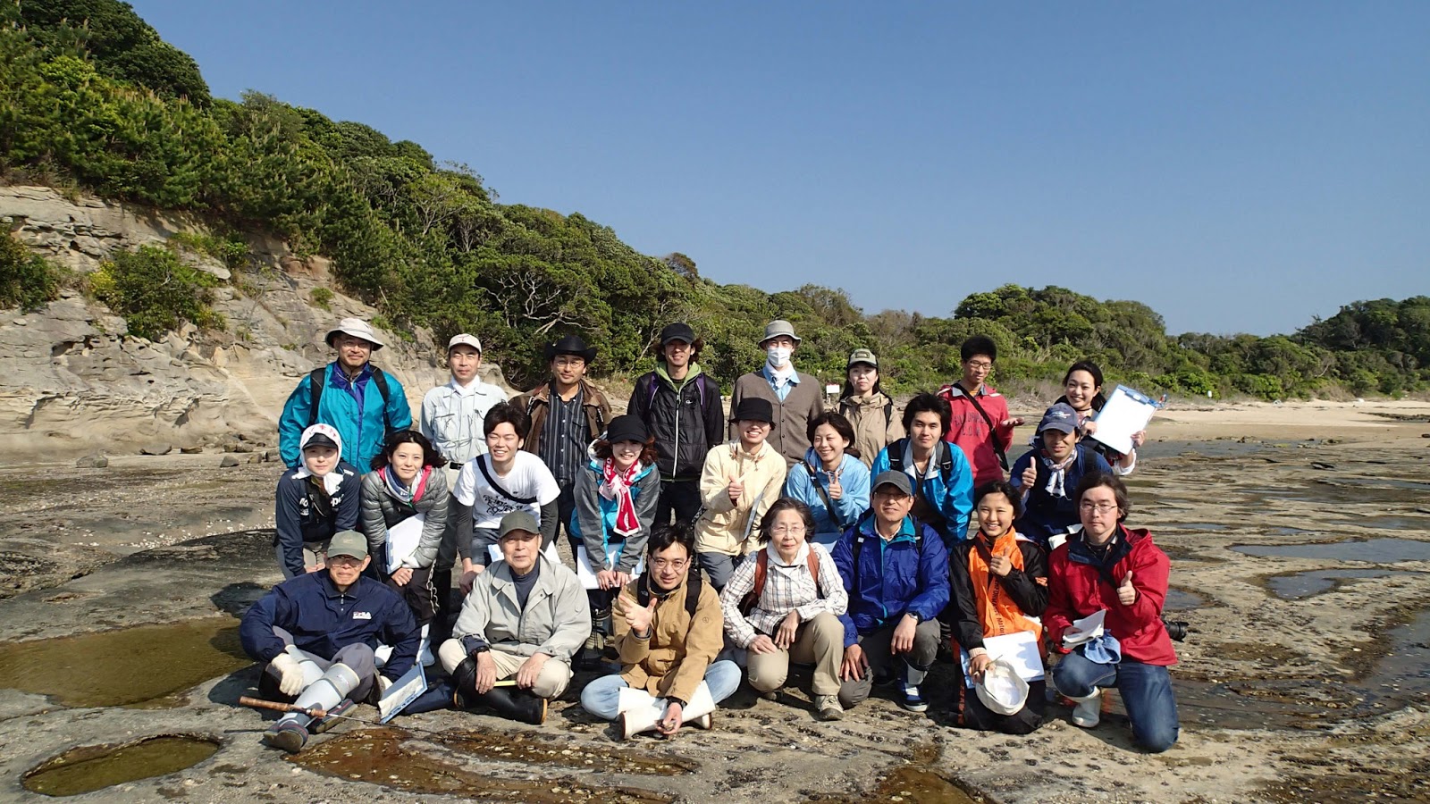 26日に打ち合わせ会、27-28日に実際の調査を行いました。総勢27名の参加者をお迎えし、軟体動物、節足動物(カニ、フジツボ)、棘皮動物、刺胞動物、環形動物を対象として、海岸生物の分布と密度を調べました。