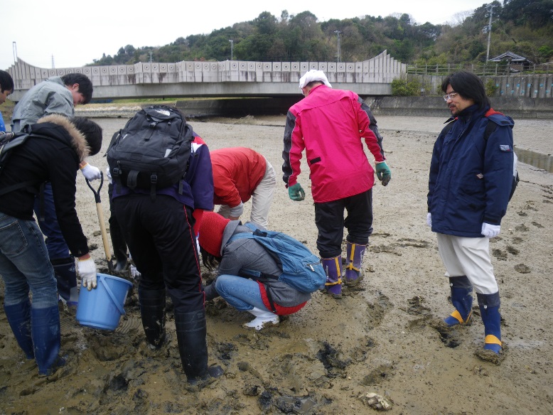 監督の朝倉先生に見守られ、スコップで干潟を掘りまくる戦士たち。