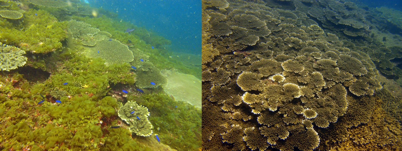 写真は同じポイントの(左)3月と(右)9月の海中景観です。海藻の有無や、海水の透明度の違いが一目瞭然です。
