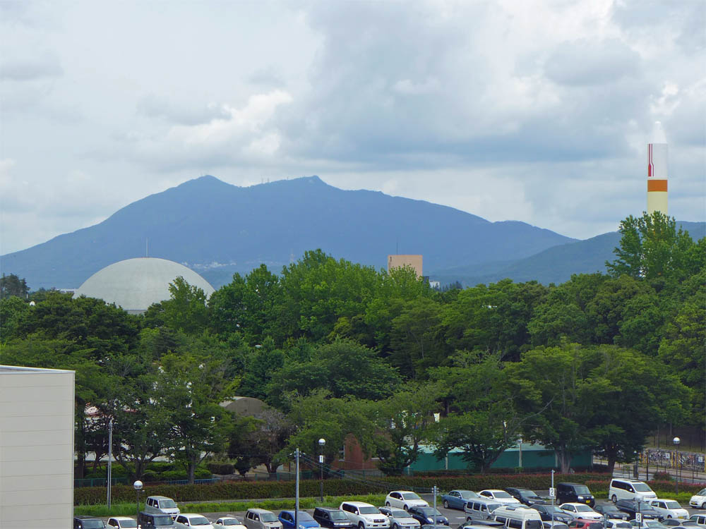 | 前泊したホテルから見た筑波山。手前左のドームはつくばエキスポセンター、右に立つのはH-IIロケットの実物大模型です。筑波らしいちょっとシュールな景色です。 |