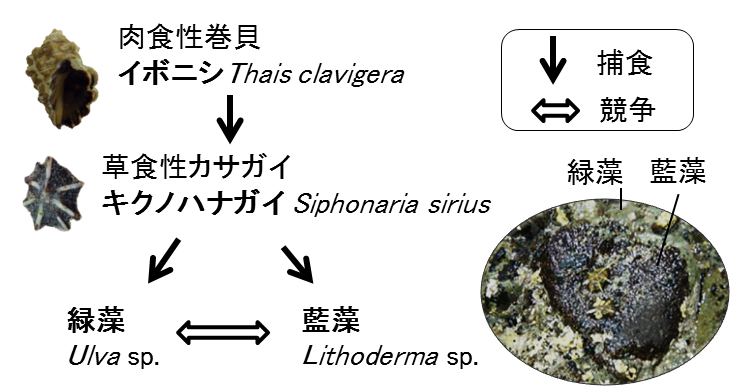 本研究では、瀬戸臨海実験所近くの岩礁潮間帯に点在する大型の転石、数十個を実験区とし、その場に存在する生態系を用いて、捕食者である肉食性巻貝のイボニシが、草食性のカサガイであるキクノハナガイを介して、2種類の藻類に与える間接効果について調べています。キクノハナガイは家痕を持ち、その周りには藍藻が生えているのですが、捕食者が駆動する間接効果により、この藍藻は緑藻に覆いつくいされ、最終的には死滅してしまうことが分かりました。本研究は、間接効果によって藻類相が変化することを野外で初めて明らかにしたものであると言えます。