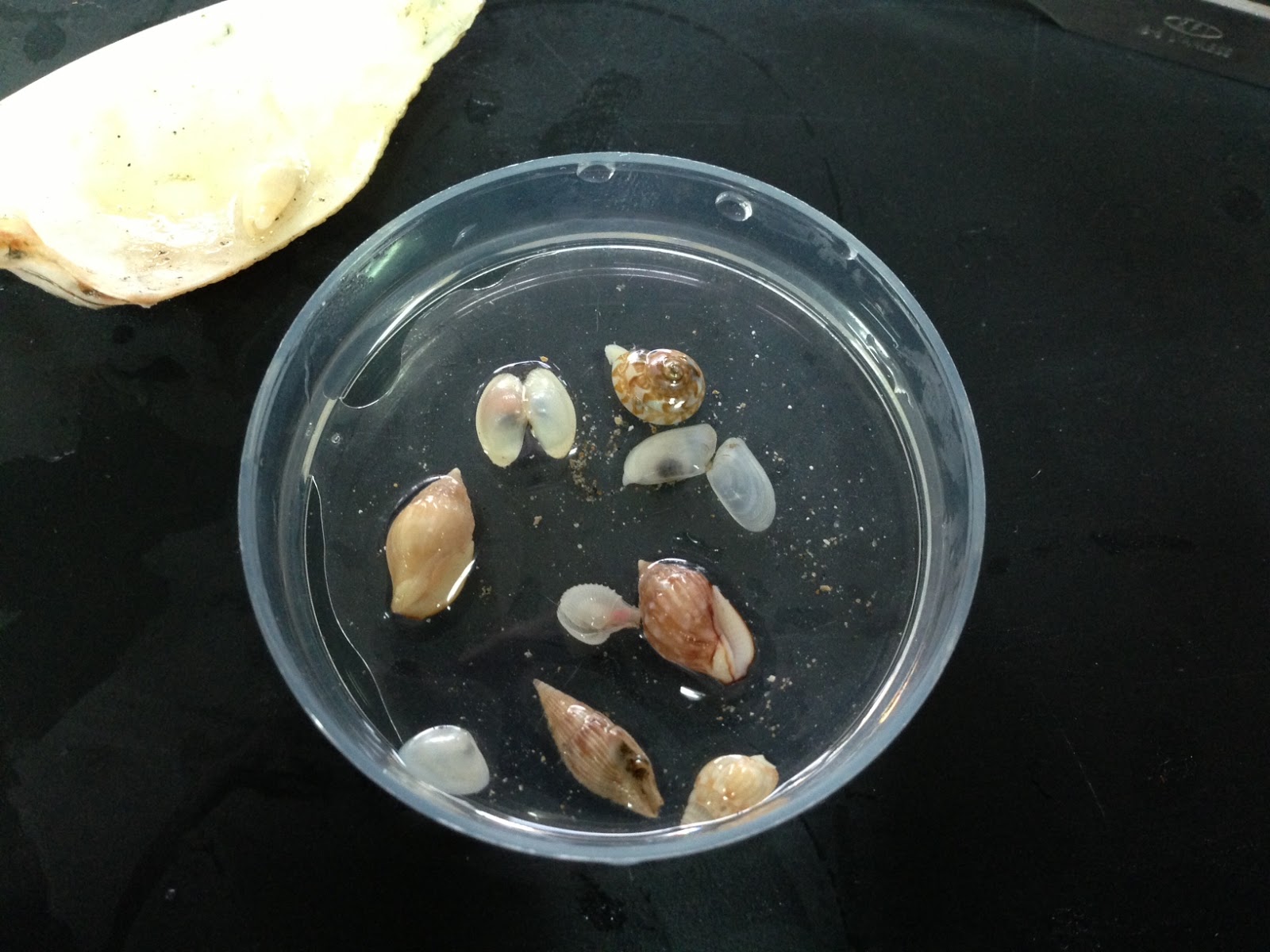 大きめの白い二枚貝3つは、オトヒメザルガイです。図鑑で鑑定しながら、ある人の言葉を思い出しました。「巻いてないと貝じゃない」。そう、貝の中でも巻貝の方が人気は上で、二枚貝に興味のある人は少数派なのです。オールマイティな人はなかなかいません。私も巻貝派なので、二枚貝の鑑定はなかなかできませんでした。