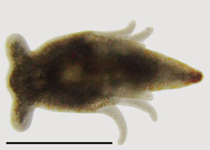 これは、扁形動物のヒラムシの幼生で、ミューラー幼生と呼ばれています。腕に比較的長い繊毛が生えていて、それを使って泳ぎます。ちなみに、成体と同じヒラムシ型に変態した個体も、プランクトンサンプルから観察できました。おそらくしばらくすると着底して、底生生物(ベントス)として暮らすのでしょう。
