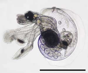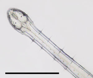 毛顎動物のヤムシです。頭部に眼が1対あって、名前の通り顎に丈夫な剛毛が生えています。この動物は一生浮遊生活を送るので、プランクトン実習で是非見てもらいたい動物です。全長5mm以上あるので、肉眼でも十分確認できます。魚類のような鰭を持ち、瞬間的に素早く移動することができます。