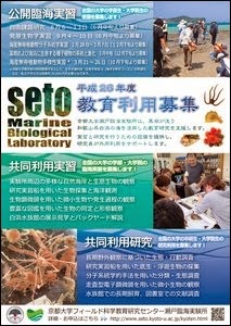 教育利用募集のパンフレットを配布しました / イベント / By M Kawamura / 2014年6月23日 posted by marikok 海洋生物に関心がある全国の大学の学部生・院生の皆さんに、瀬戸臨海実験所をよく知ってもらい、より利用していただけるよう、パンフレットを各大学に配布しました。 下記リンクよりpdfをダウンロードできますので、どうぞご利用ください。 瀬戸臨海実験所 教育共同利用拠点ページ また、今夏の公開臨海実習「自由課題研究」と「発展生物学実習」の受講申込の受付が始まっています。少しでも海の生き物に興味を持っている方は、どんどんご応募ください!
