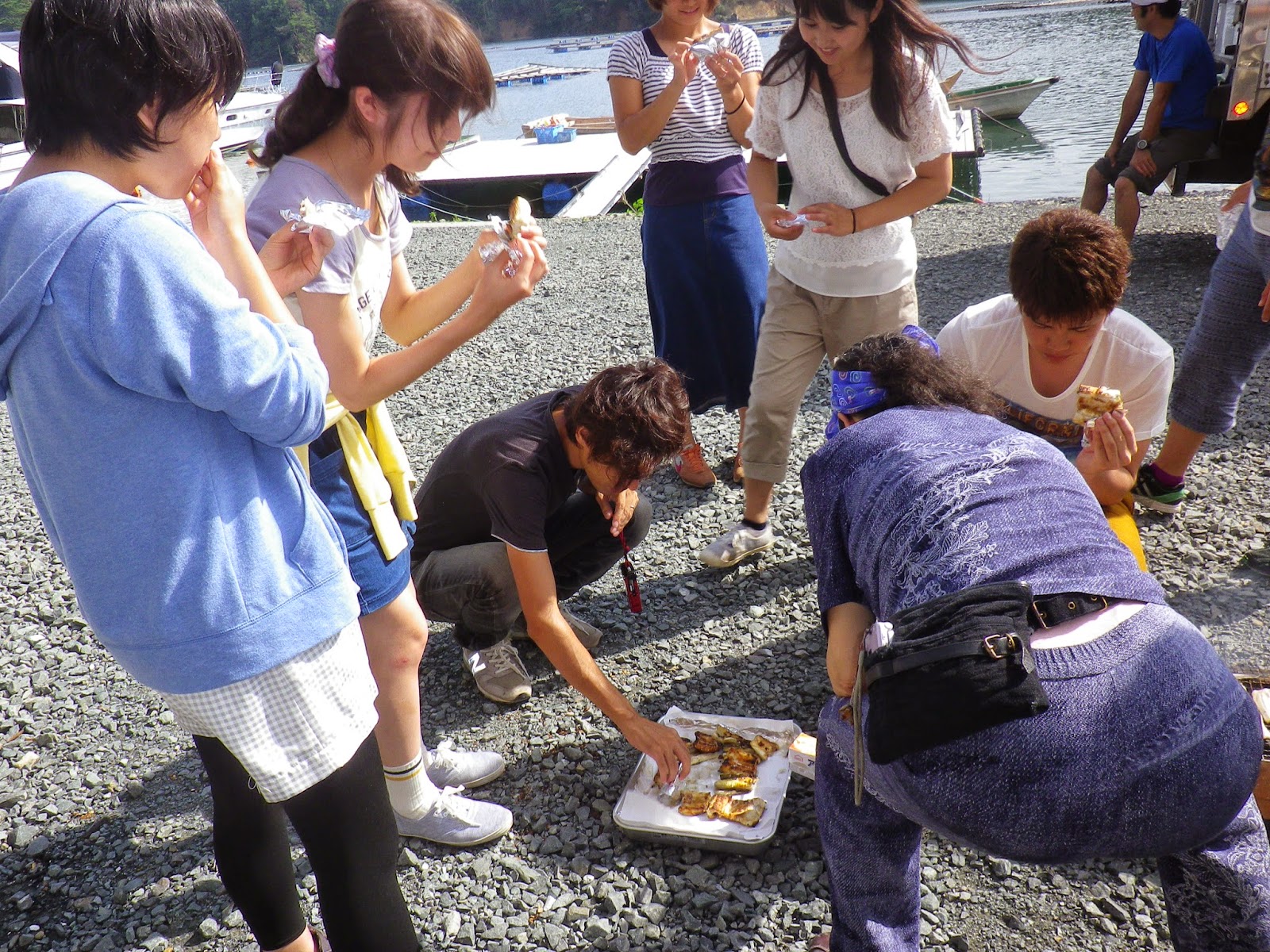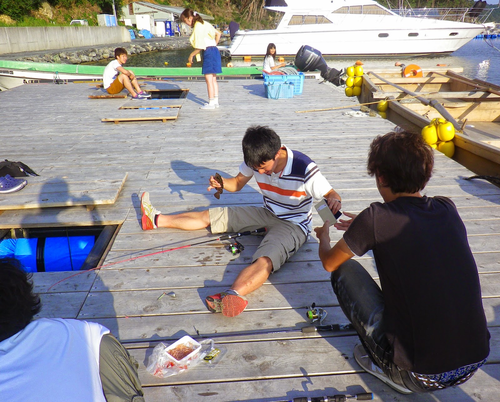 さて、おなかが一杯になったあとは、釣り体験。短いさおで、船着き場から糸をたらします。中野先生が釣りの名手なので、みんなにやり方を教えています。