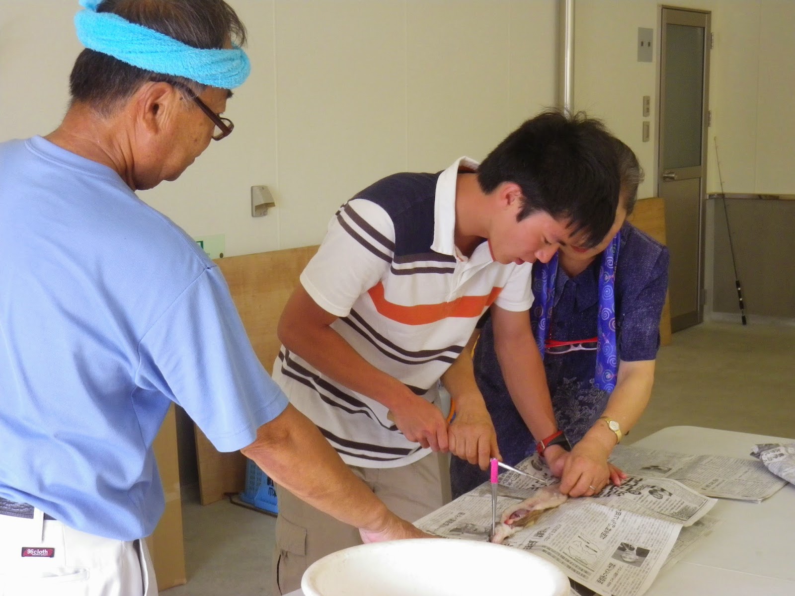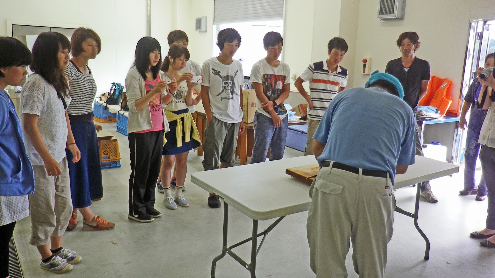 さて午後は、昨晩みなさんが釣り上げたハモとアナゴの調理体験。まずさばき方を、その道のベテランに教えていただきます。包丁さばきが、相当に難しそうです。