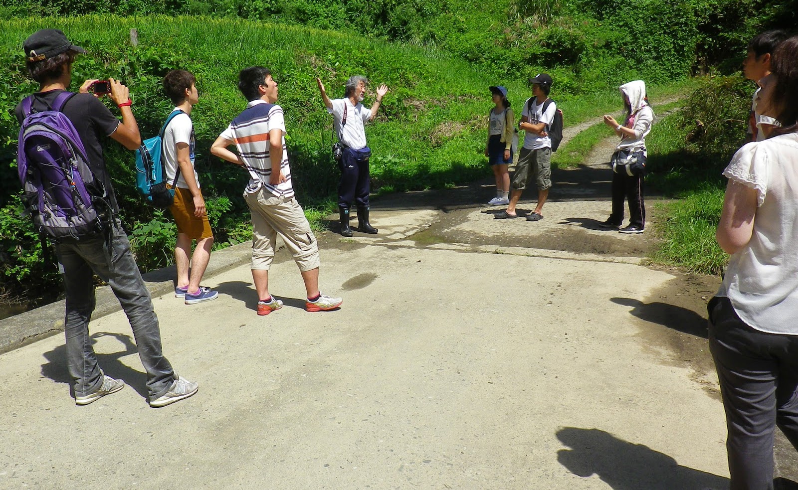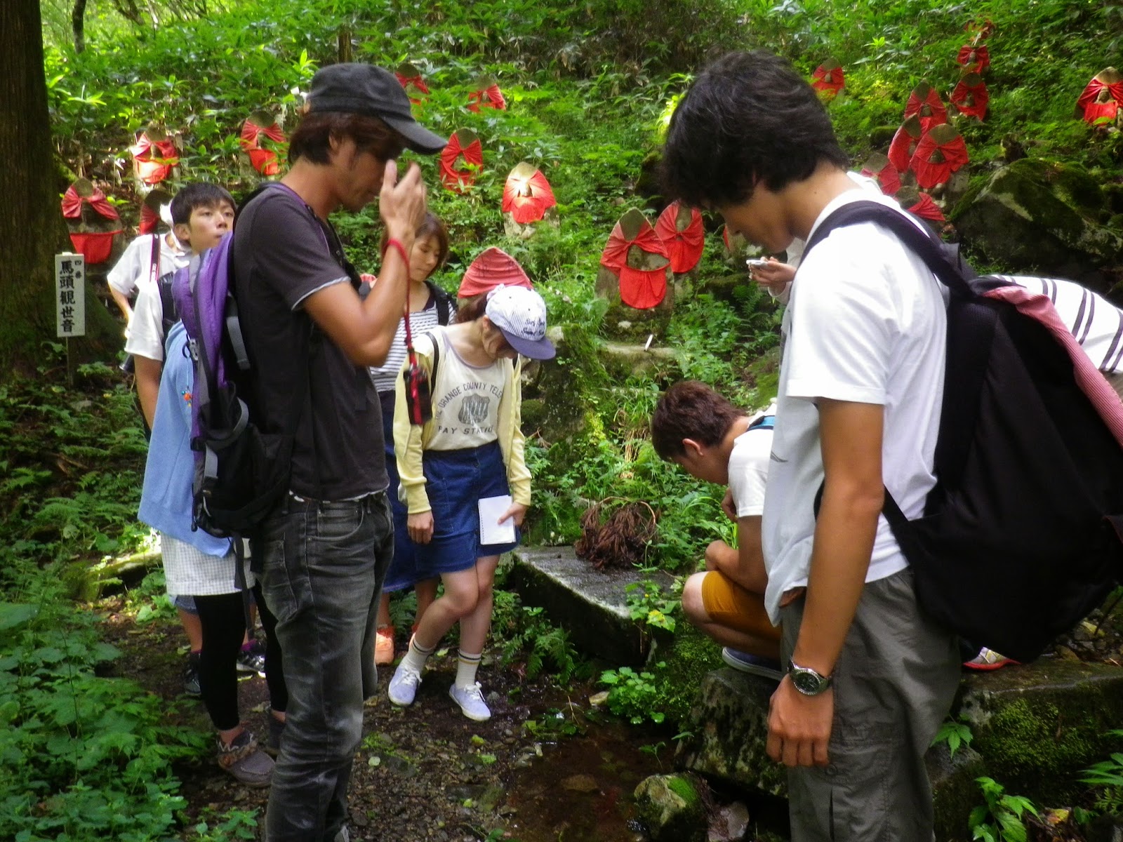 神社の中に湧水が出ているところがあり、かわいいサンショウウオがたくさんいます。学生さんたちが見入っています。この周辺はブナ林で、豊かな生物相を形成しています。