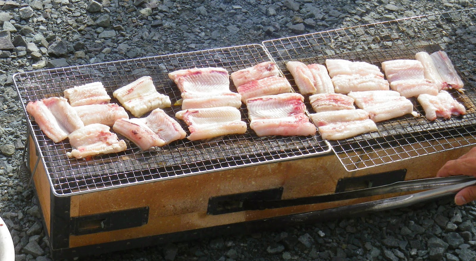 さて、焼けたところで食べていきます。もう絶品のおいしさ! 味はウナギとさしてかわりません。というよりは、私は個人的には町で売っているウナギよりもはるかに、ウナギらしいおいしさであると思いました。もちろん、ハモとアナゴは、ウナギとは別種です。何もつけなくても、きわめて美味。新鮮というのは、こういうことなのですね。