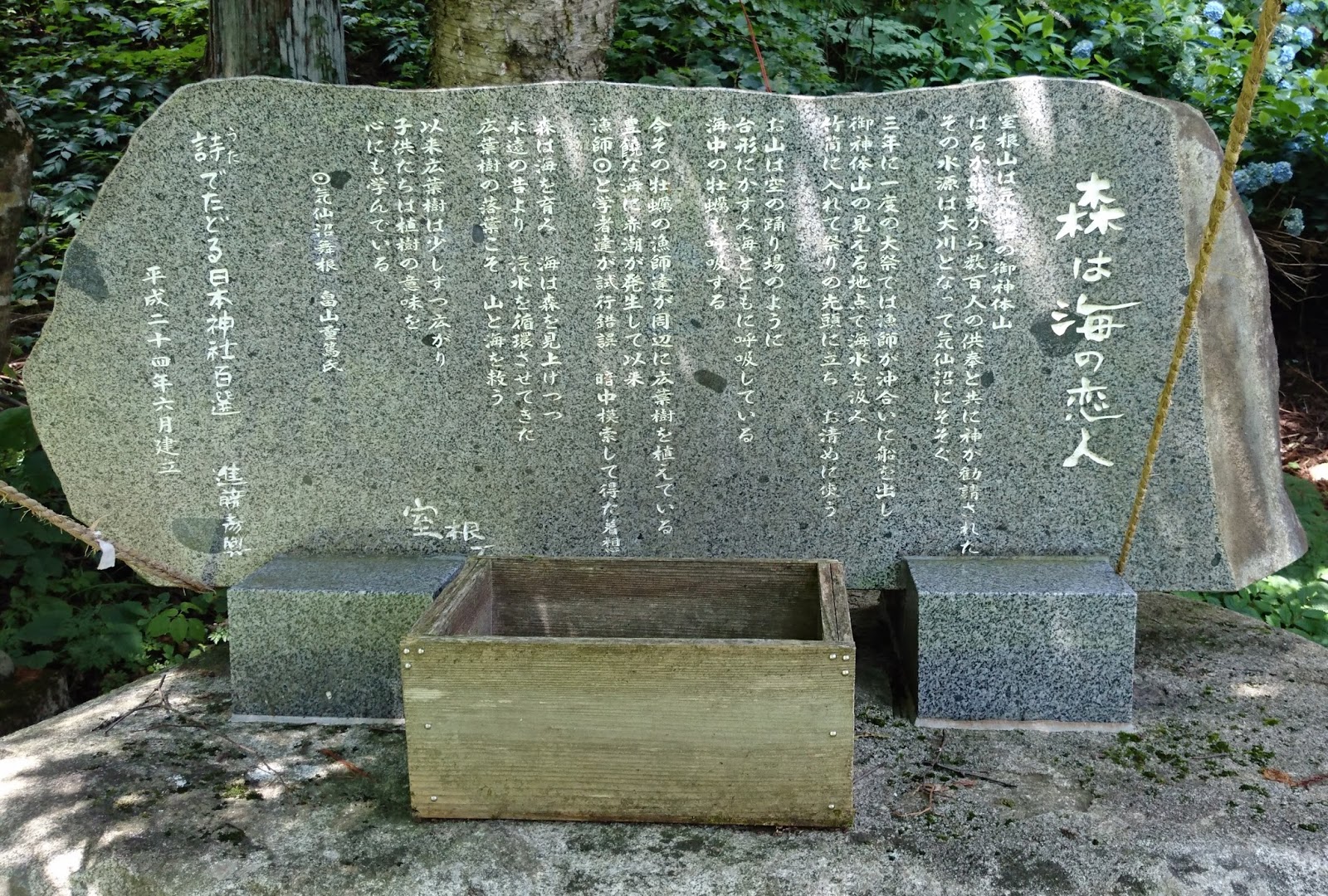 室根神社には「森は海の恋人」の石碑があります。石碑の前の木には、おみくじがたくさん結んでありました。なんでもこの石碑の「恋人」にひっかけて、人々からいつのまにやら、縁結びの神様のように崇めているそうな。