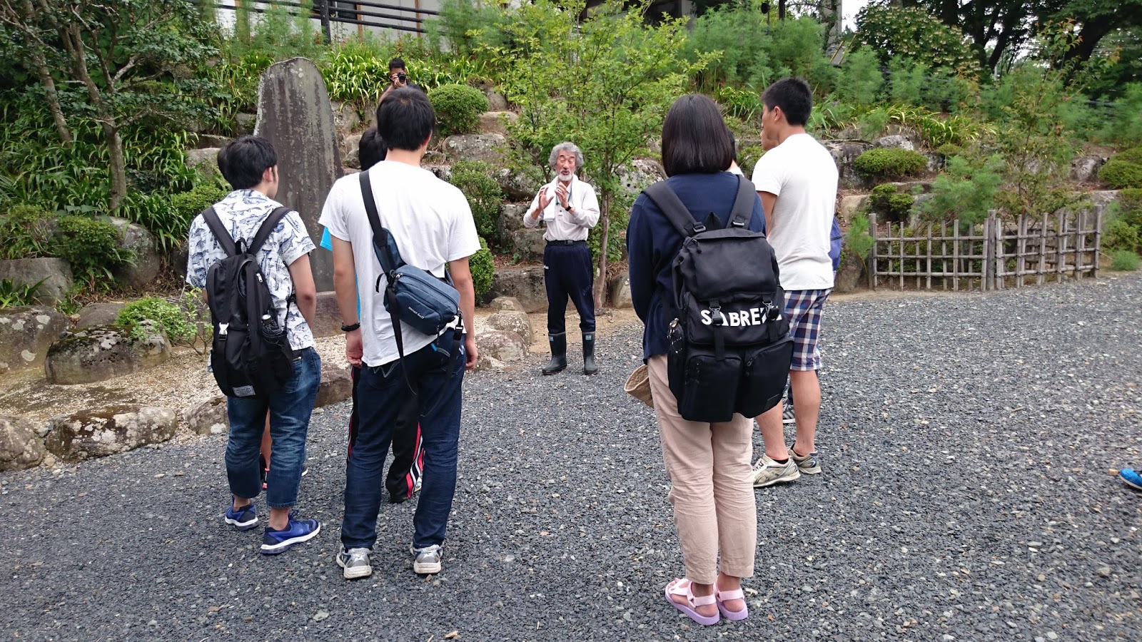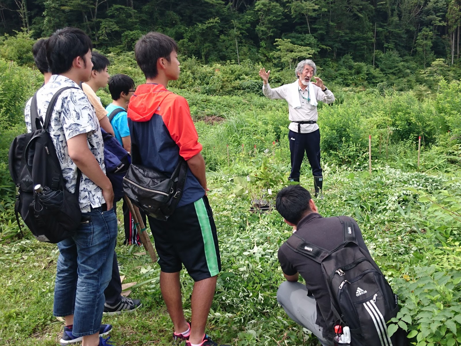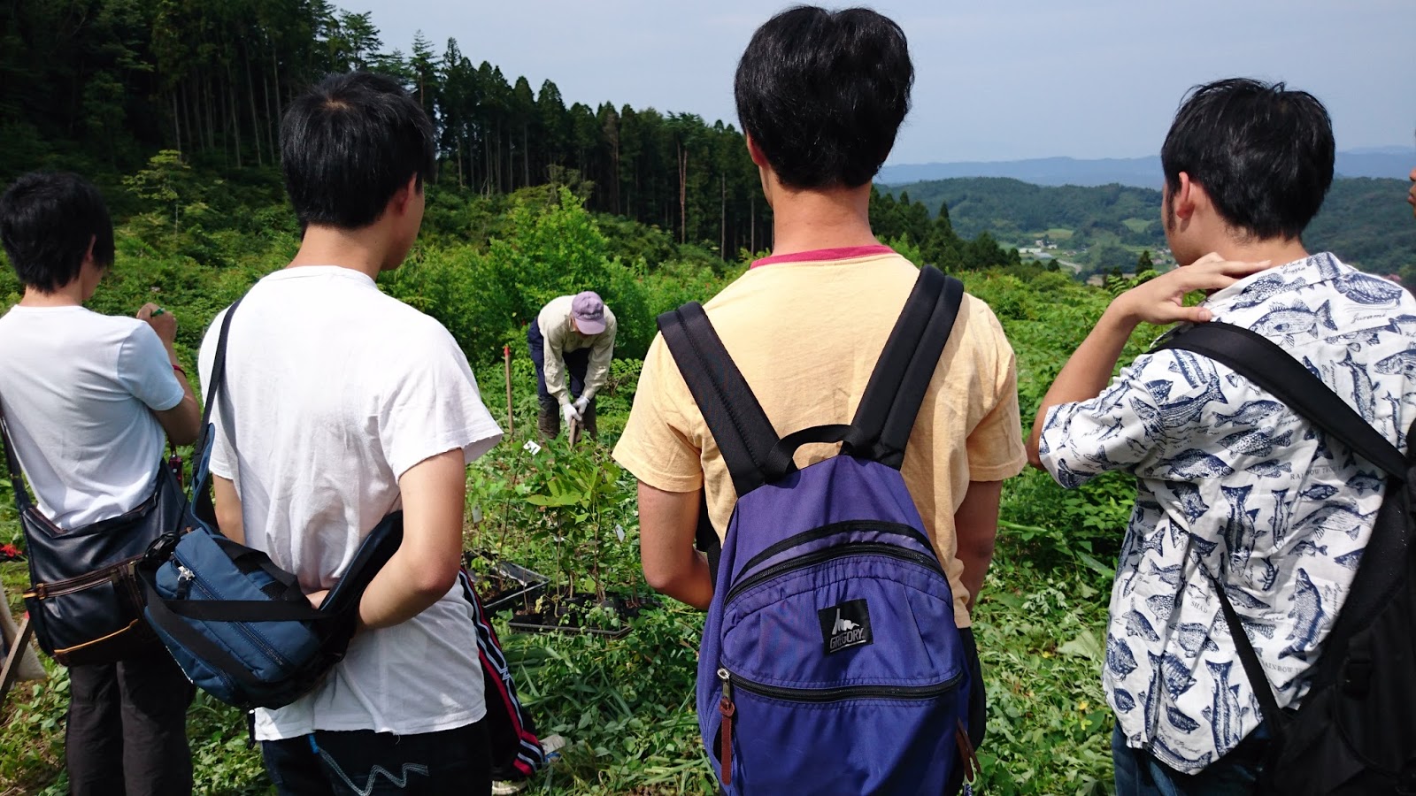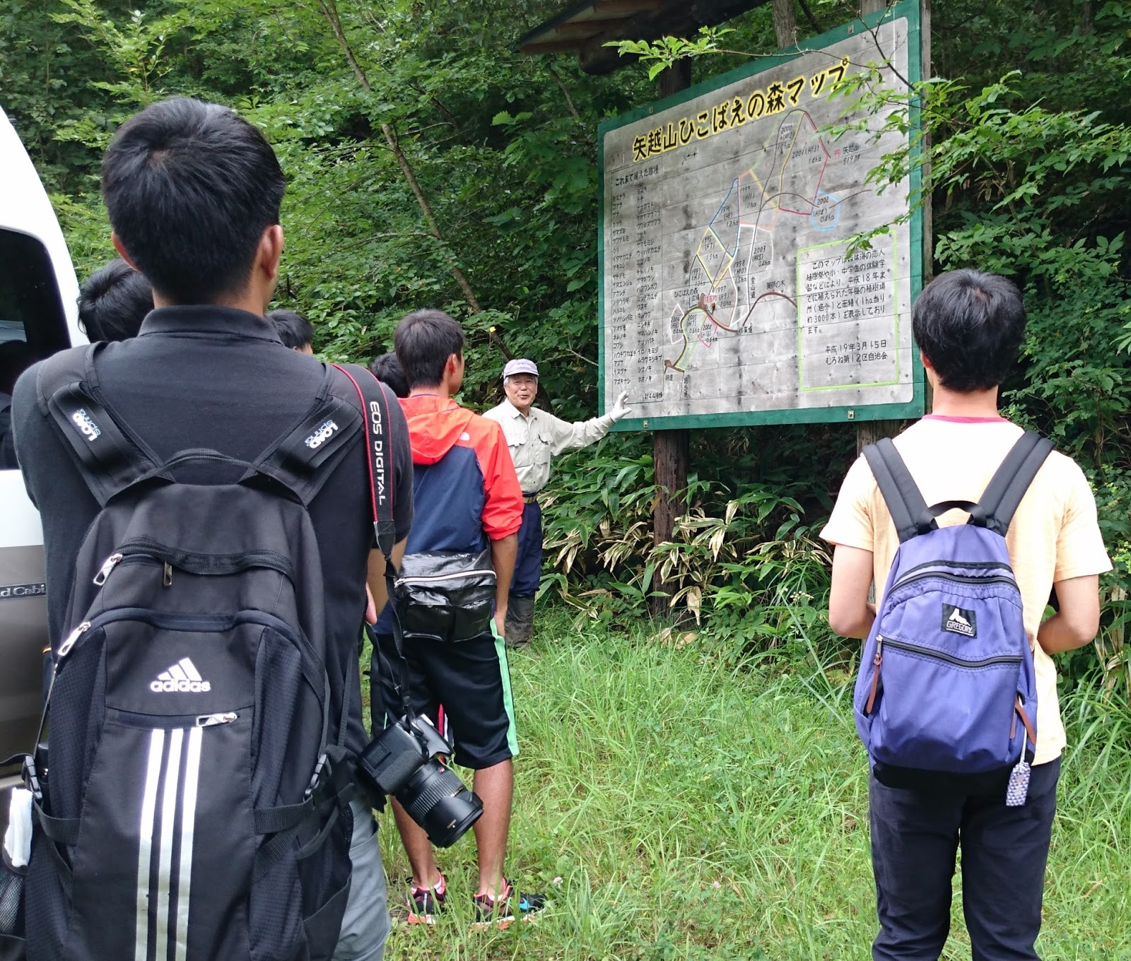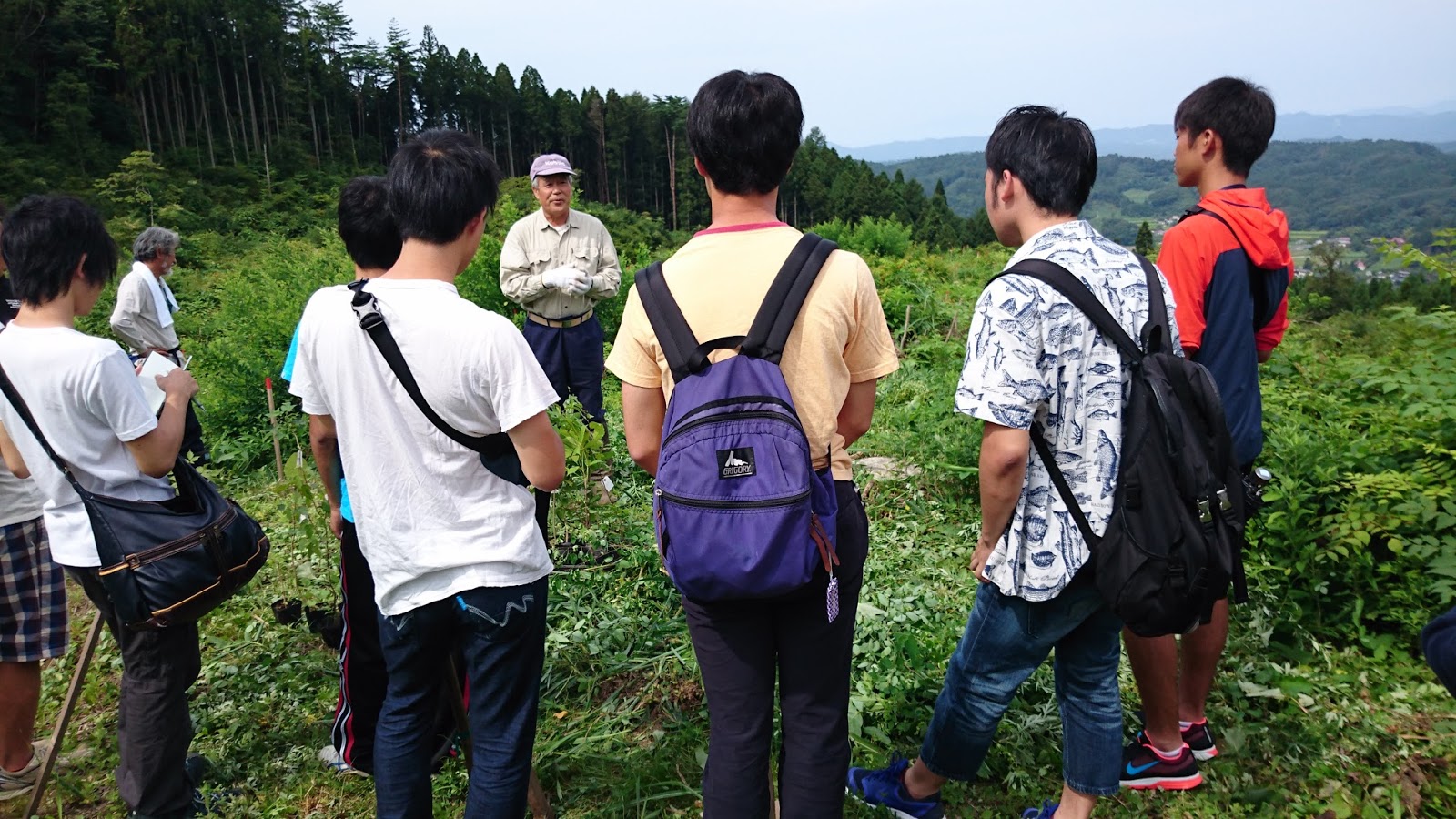 畠山さんらを中心として植樹が行われている山に登り、植樹体験をします。まず、その概要についての説明を受けます。