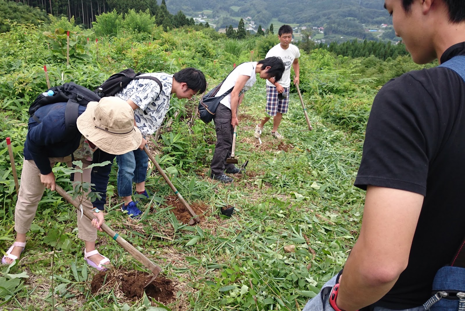 いよいよ植樹開始です。あらかじめ畠山さんに用意していただいた苗木を一定間隔で植えていきます。