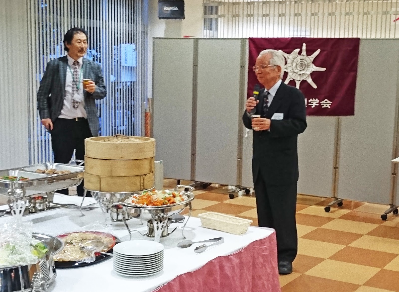 | 懇親会でご挨拶される奥谷先生(右)。 左は現在の日本貝類学会の会長の大越健嗣東邦大学教授。 |