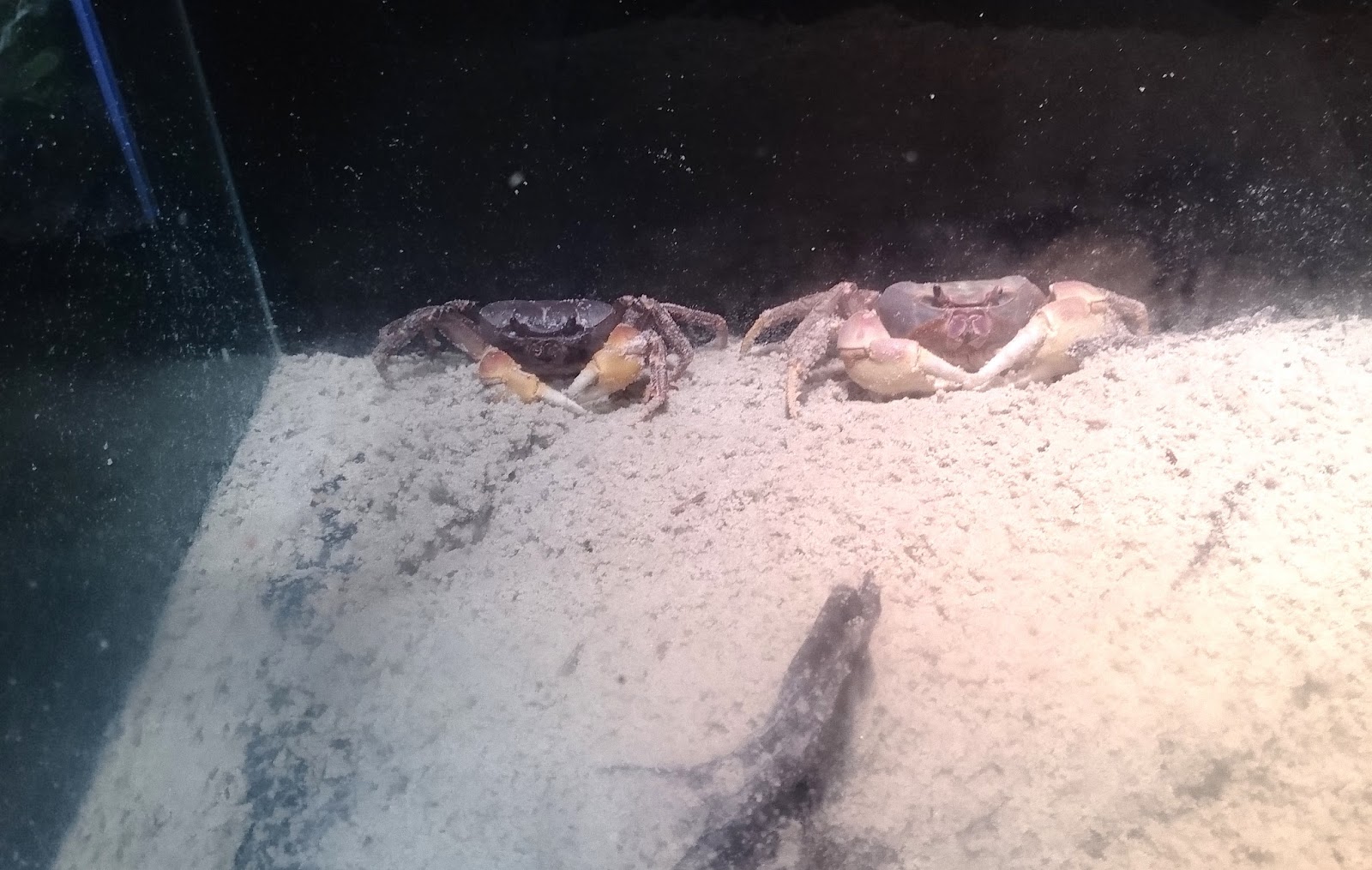 この展示を作成した中心人物の一人は、須磨海浜水族園の宮嶋彩さんですが、この方は大学院生時代は瀬戸臨海実験所の教育拠点共同研究員として、フィールドワークをしていた方です。当時の所属は奈良女子大学大学院で、カニの行動、生態学で有名な和田恵次先生の薫陶を受けていました。
