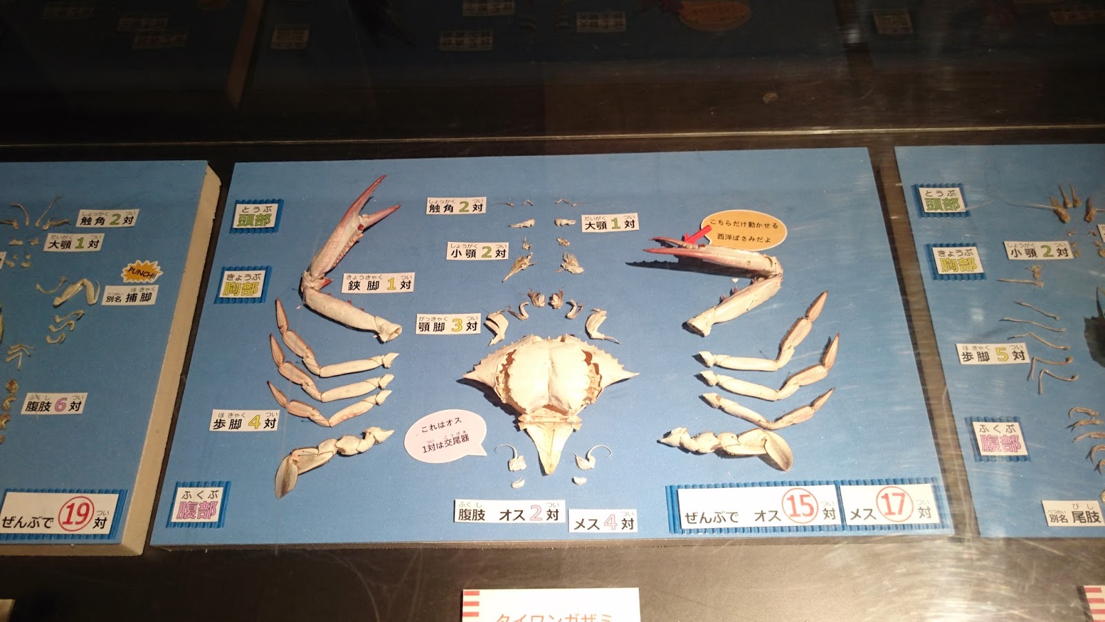 | カニの付属肢を説明する展示です。 甲殻類は基本的に1つの体節に1対のY字型の付属肢がついたものが、連なった形をしています。これが進化のプロセスの中で、さまざまな形になり、触角、口器、はさみなどになっています。 |