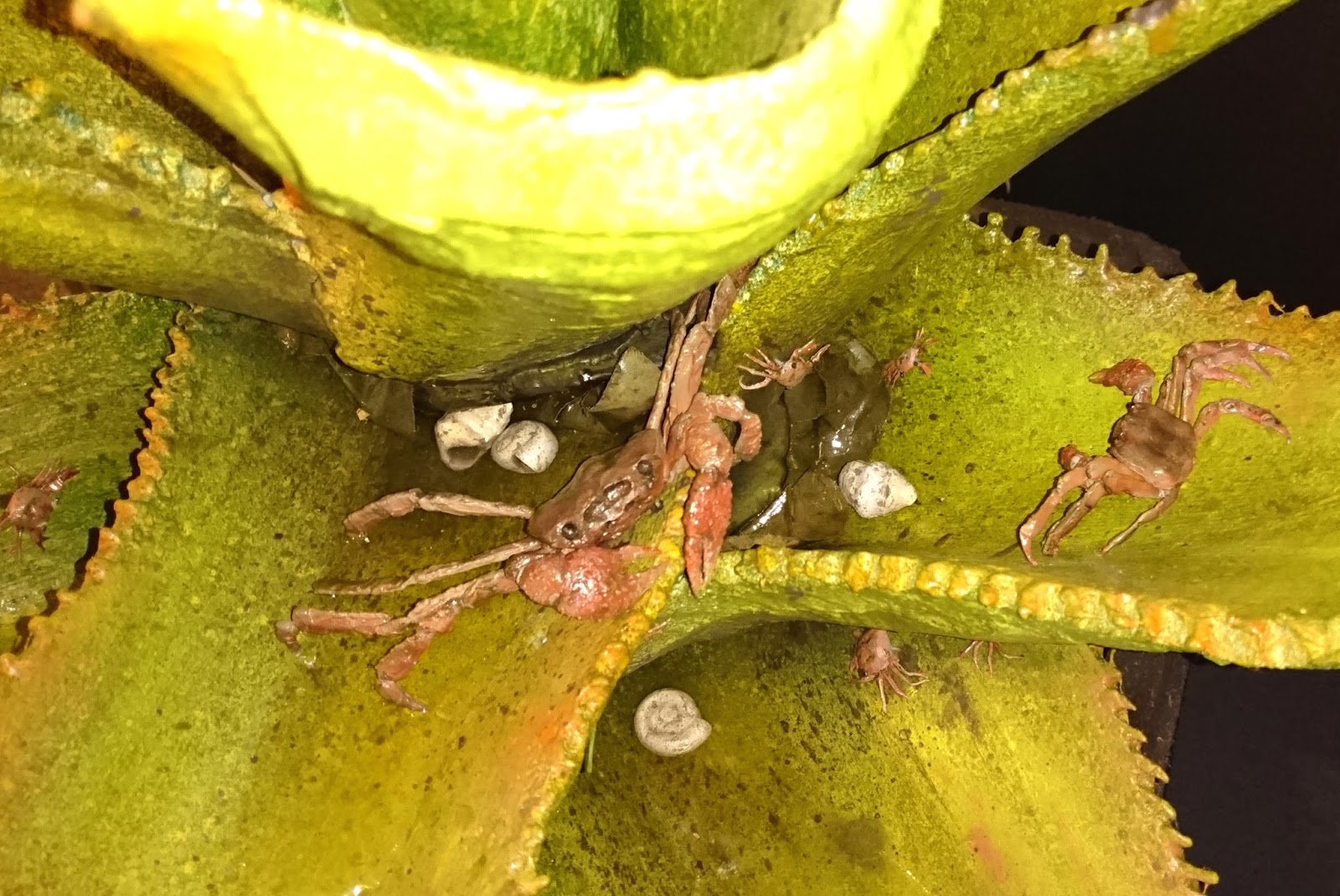 | ブロメリアの葉で子育てをするブロメリアガニの模型です。 |