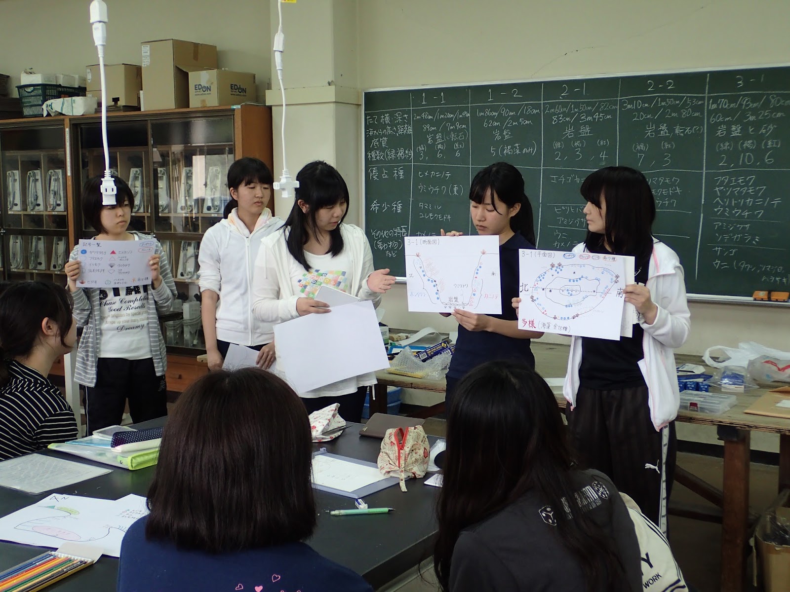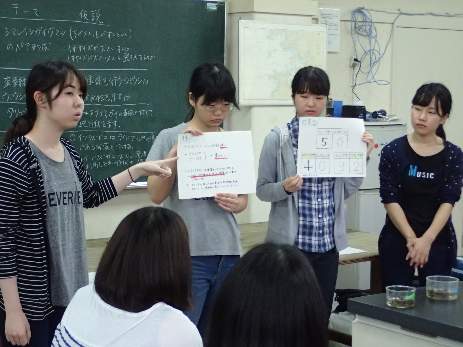 得られたデータをまとめて、2つの性質が異なるタイドプール間の生物相の比較をします。6人もいれば文殊の知恵×2。