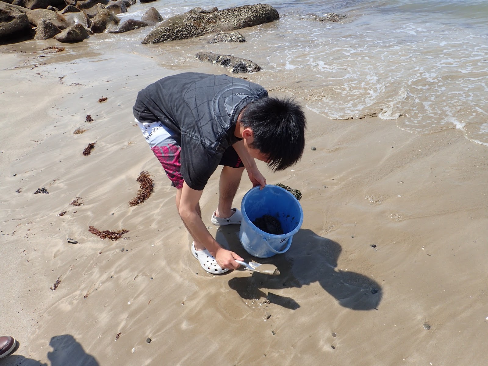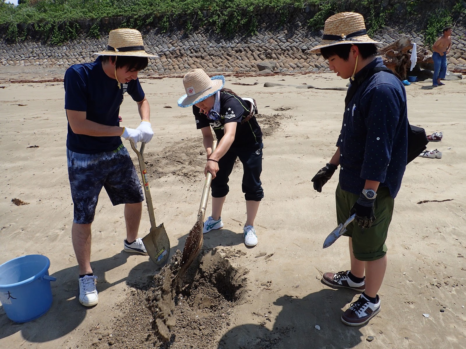 海岸の砂中にも間隙生物は潜んでいます.浅場の砂と深場の砂を採集して,そこに棲む生物を比較します.まさに「穴を掘れ,そして埋めろ」の作業です.