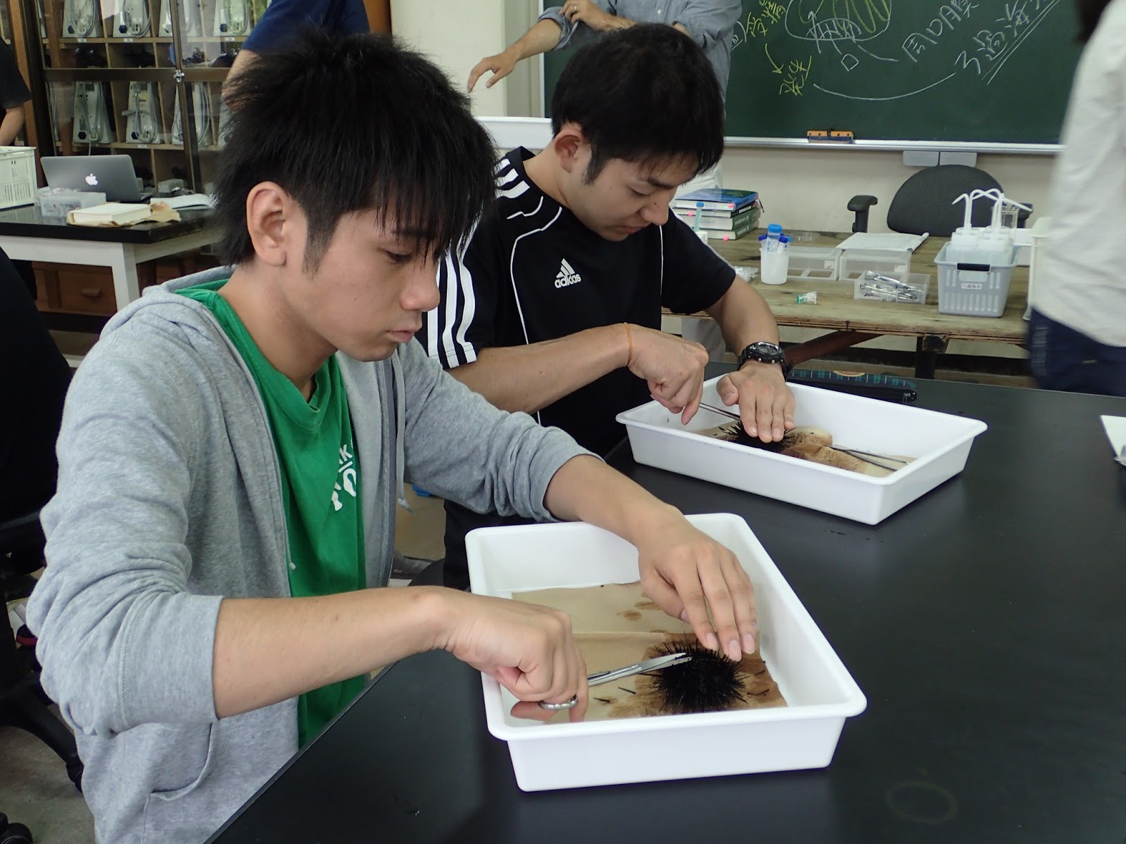 つづけてニセクロナマコの解剖です.ウニとあわせて棘皮動物の体の基本構造を学びます.それにしても,いい顔してますな.