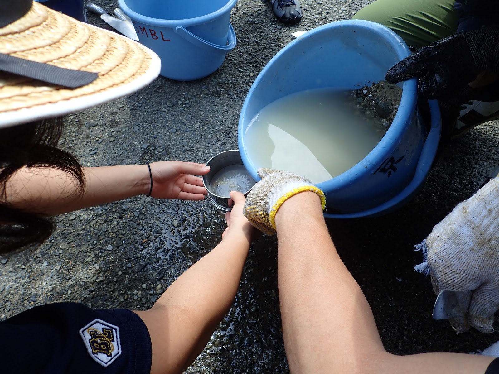 採集した基質から間隙生物を洗い出します.はじめは水道水を入れ,よーく振ってから篩で受け止めます.浸透圧ショックによって,基質にしがみついている生物が離れるそうです.