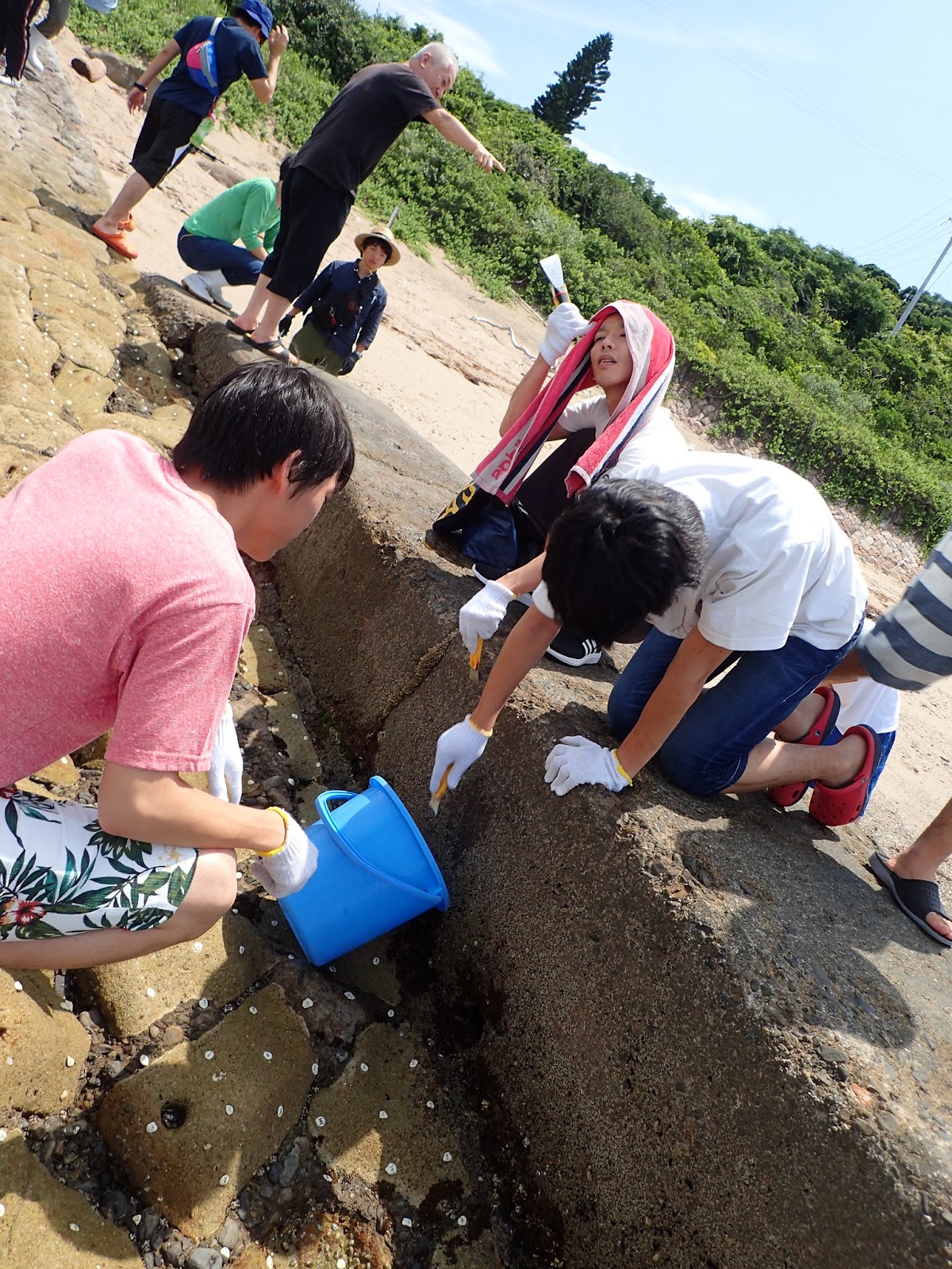 イワフジツボ採集の風景ですが,暑さに苦しむ様子がよくわかりますね.