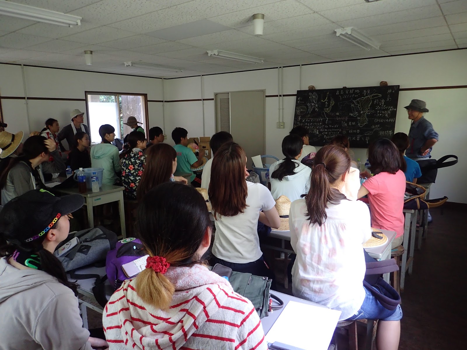 畠島分室にある伝統の黒板の前で,大和先生から島の生物相についてレクチャーを受けます.