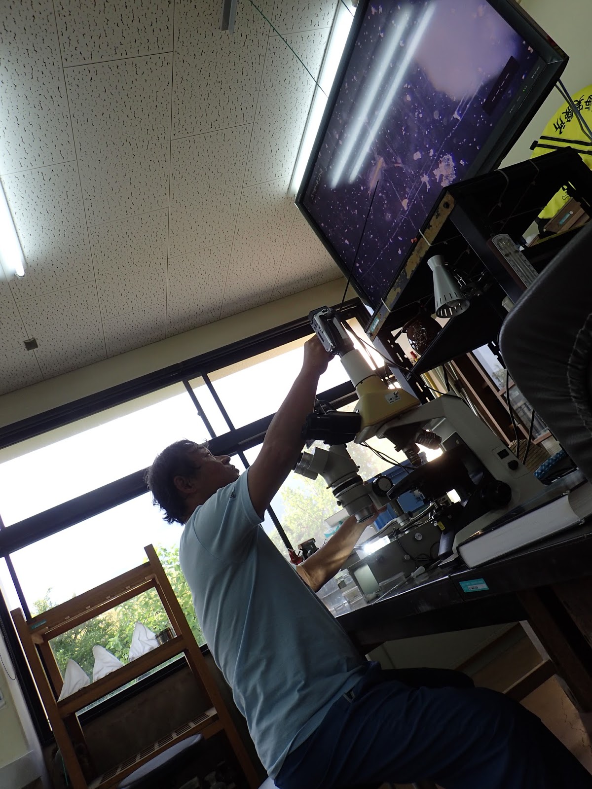 ラボに戻ってプランクトンの観察です.久保田先生には、モニターを使いながら生きた状態の浮遊生物を解説していただきました.これは1部の実習内容。