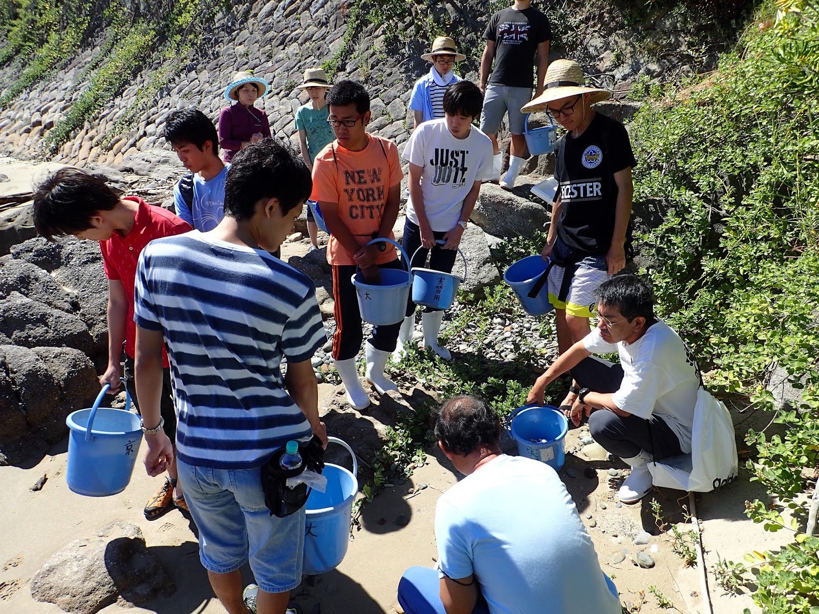 2日目はプランクトンの観察ですが,その前に北浜で漂着物の観察です.初日とは打って変わって日差しがまぶしい一日です。