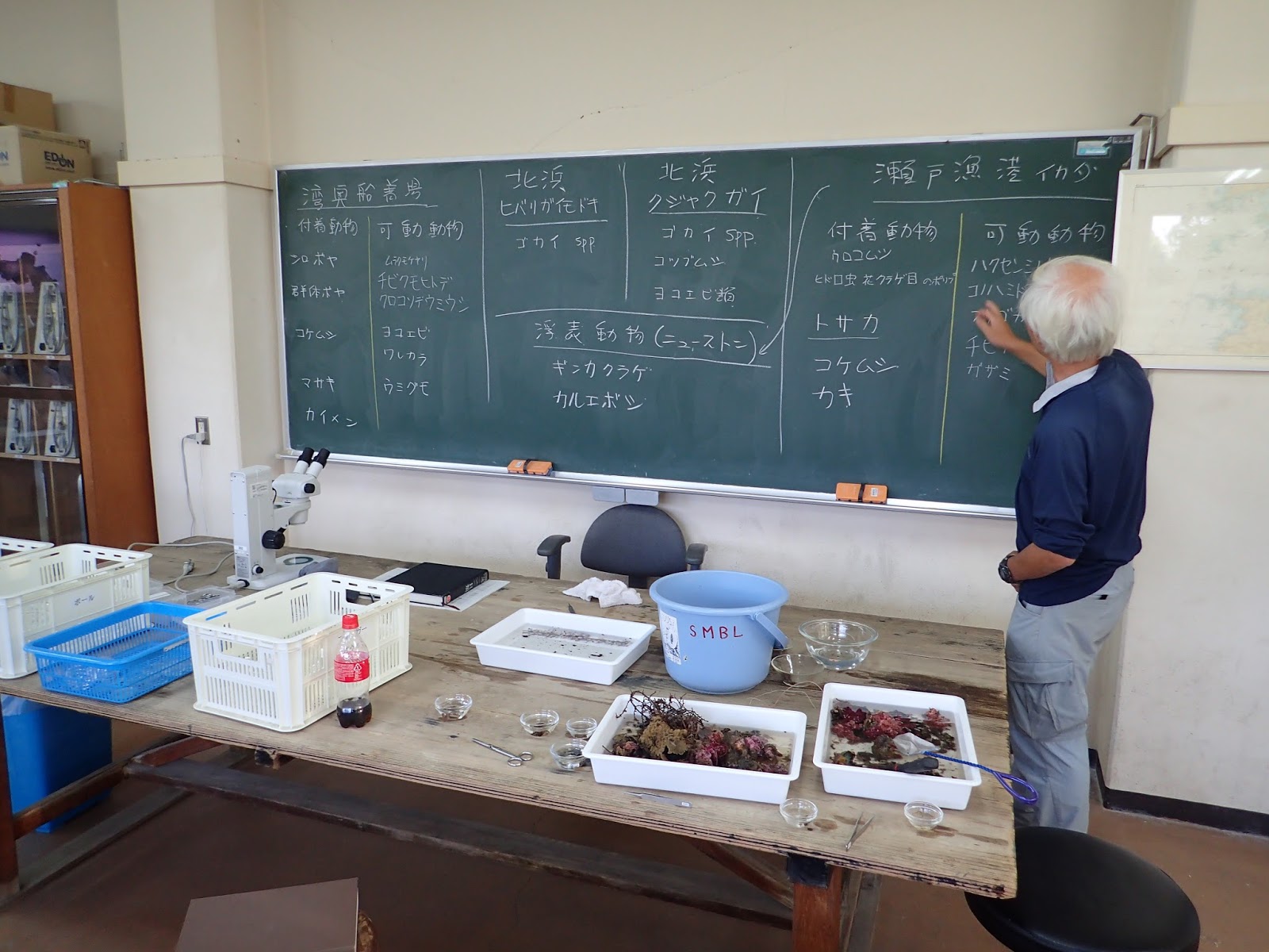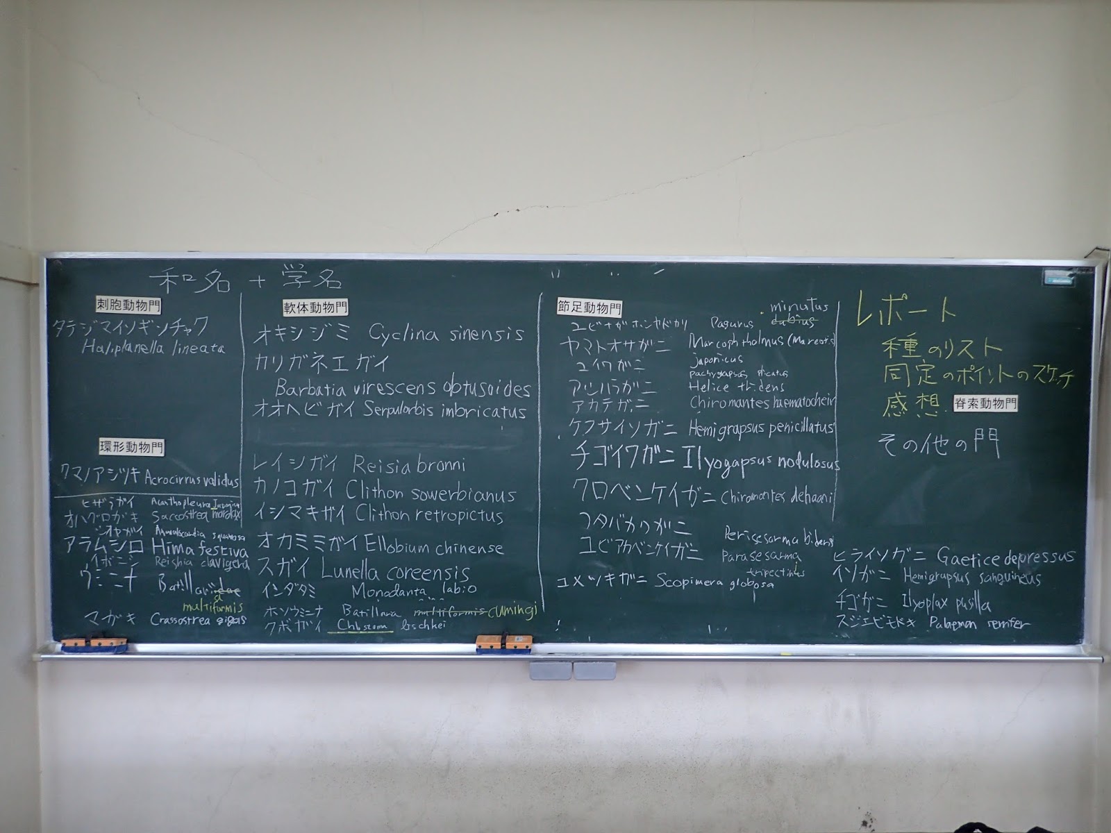 この日の成果はこのようになりました.黒板の右隅にもあるように,採集した生物のリストといくつかのグループに関しては同定のkeyとなる部分のスケッチ,そしてこの日の感想をレポートとして提出してもらいます.