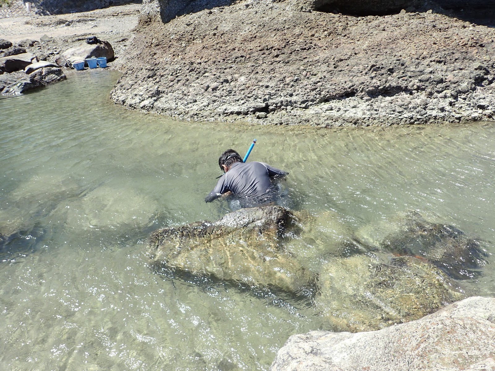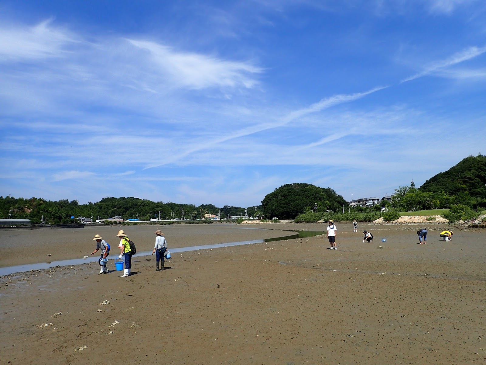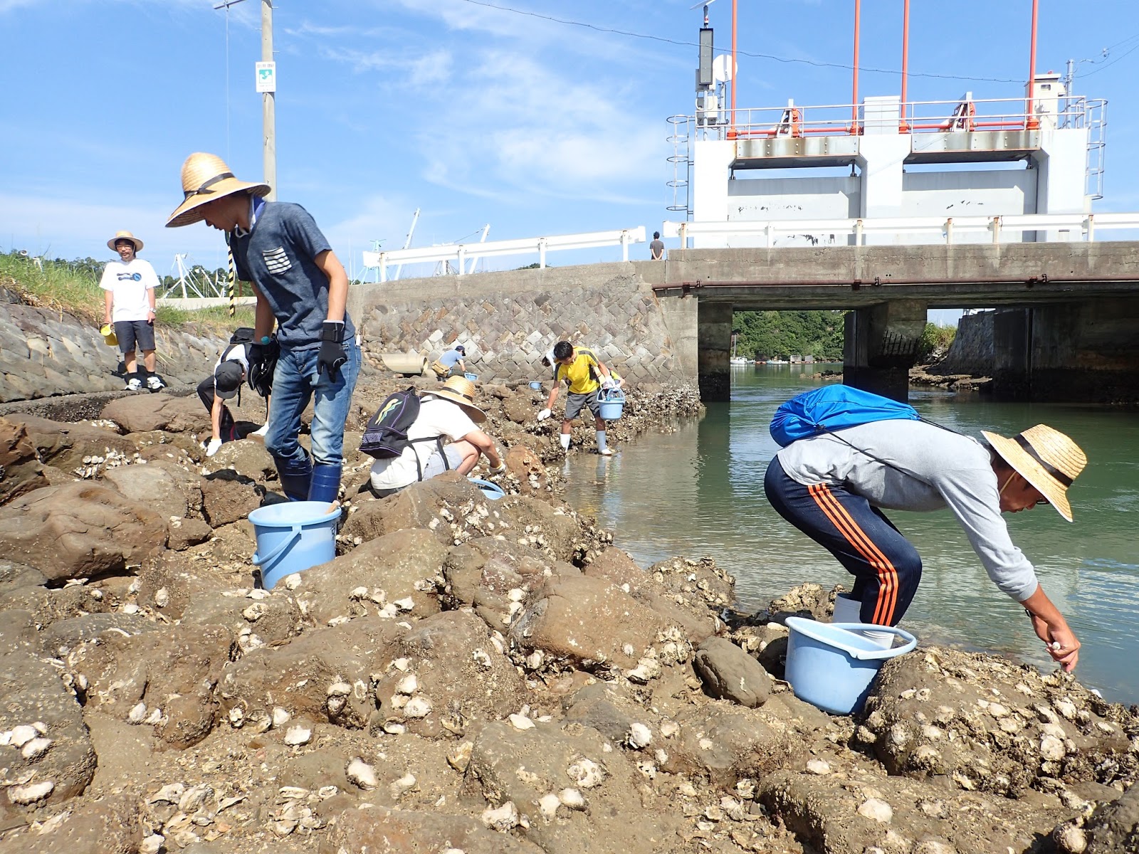 4日目は干潟・河口域での生物採集と観察です.まずは河口の水門前で貝類や甲殻類を探します.実験所周辺の磯とは全く違う環境を体感できます.