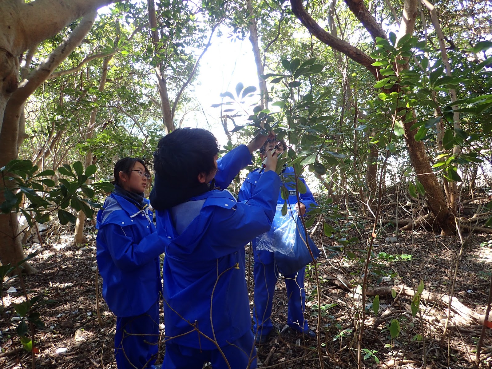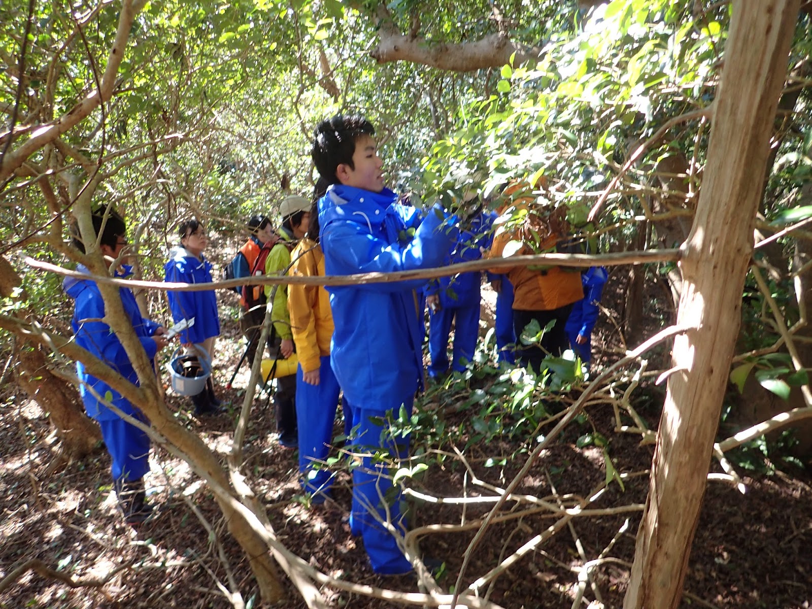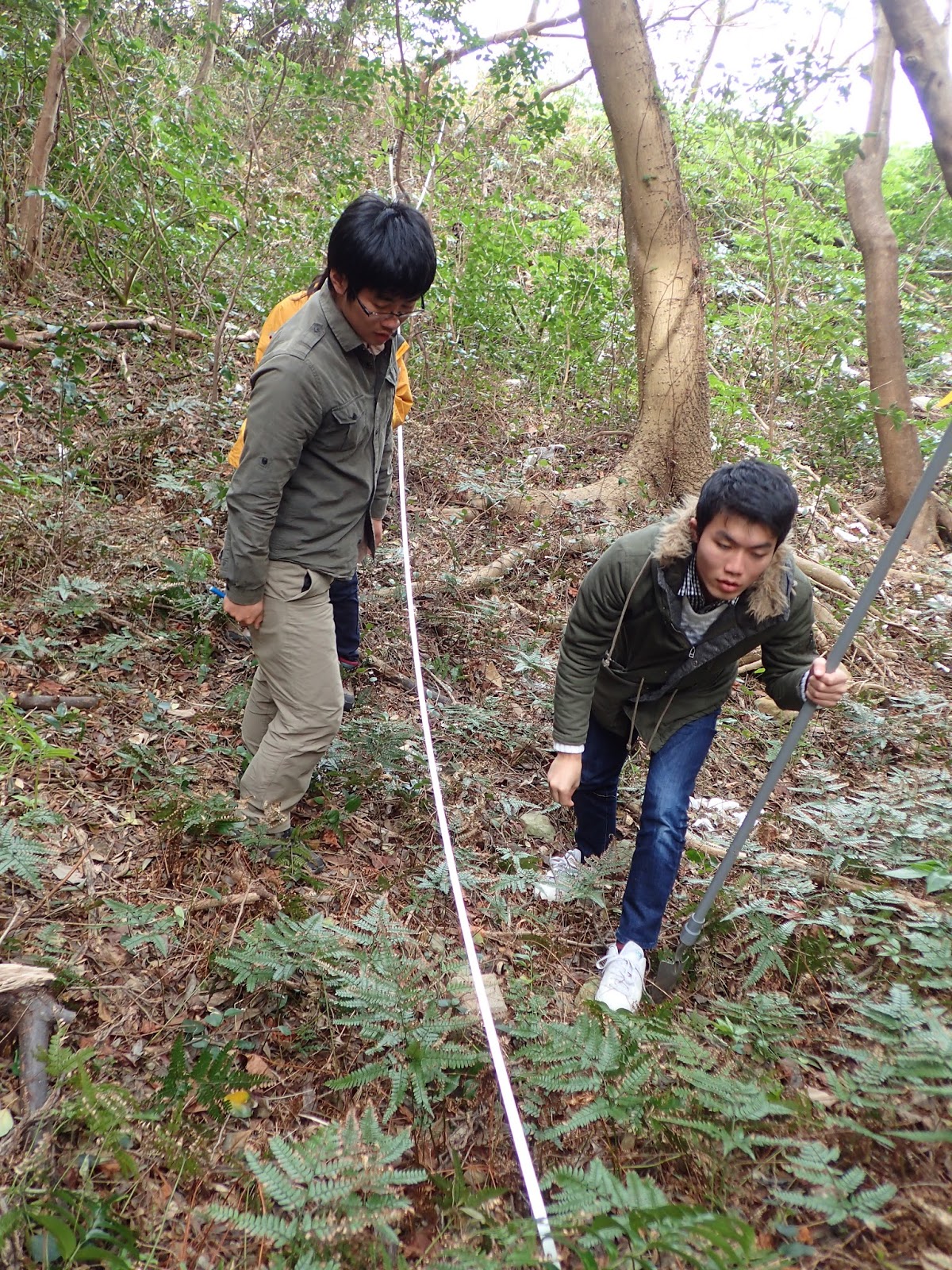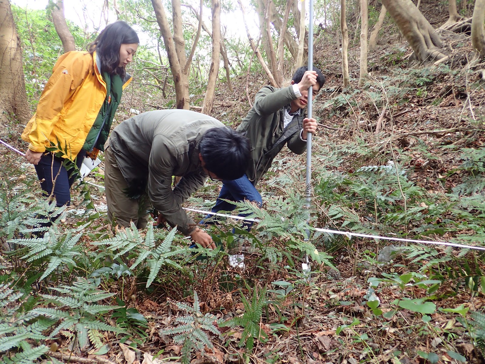午後からは班ごとに自由課題に取り組んでもらいました.こちらの班は習ったばかりのライン調査を応用して,番所山公園の南北斜面の植生比較を行いました.