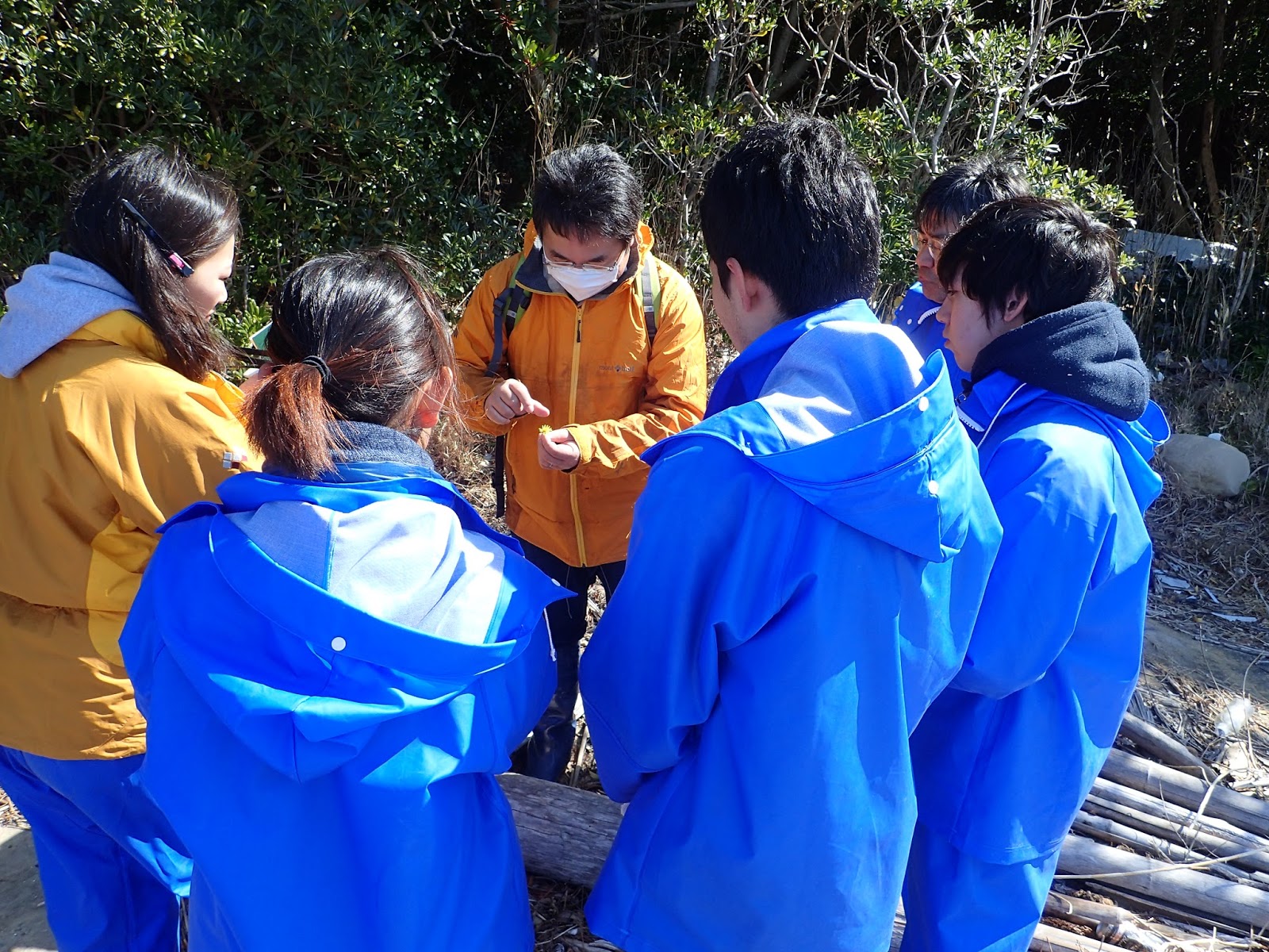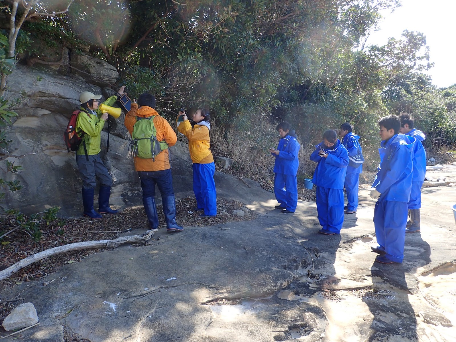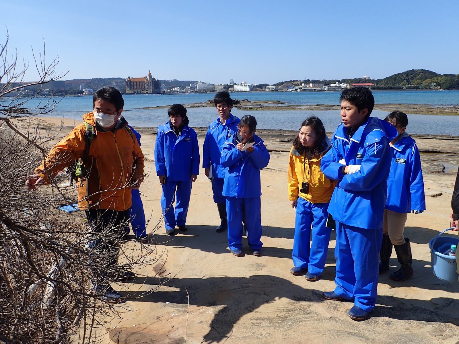京大理学部の田村先生と布施先生による解説を受けながら,島内の海浜植物を観察していきます.