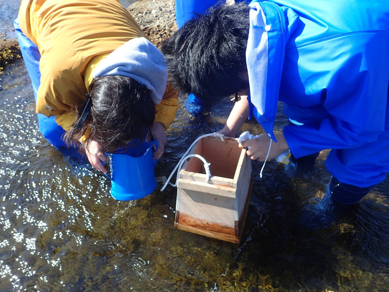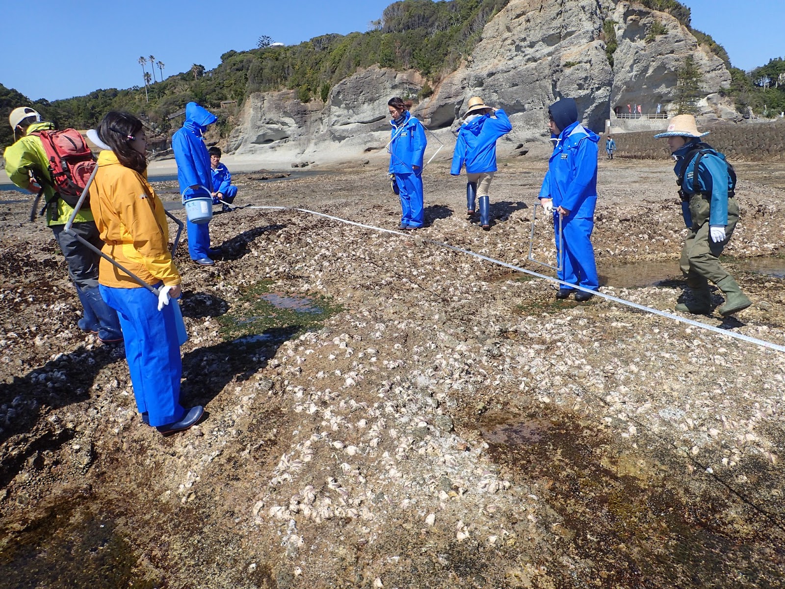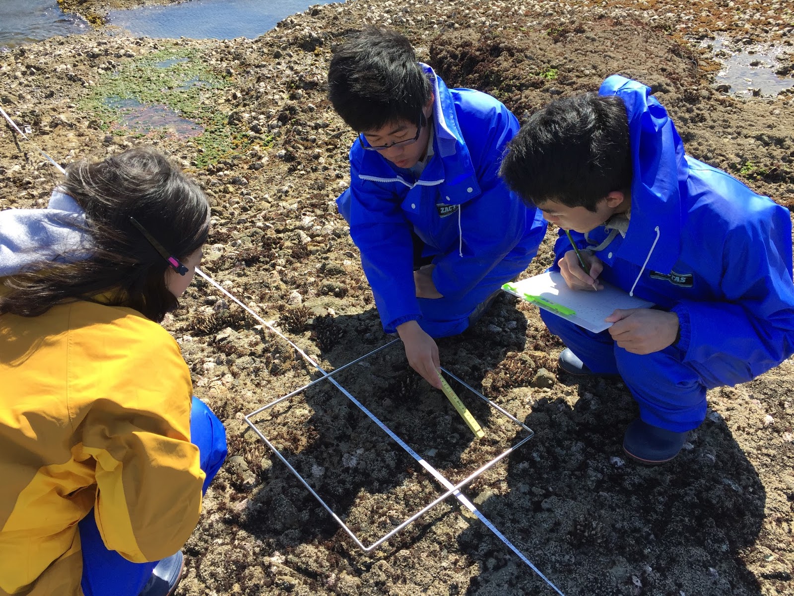 10mのライン上を1m間隔で10地点に区切り,50㎝四方のコドラート内の藻類(と動物)の被度を調査していきます.一番端は海中になってしまうので,箱メガネを使って調べます.