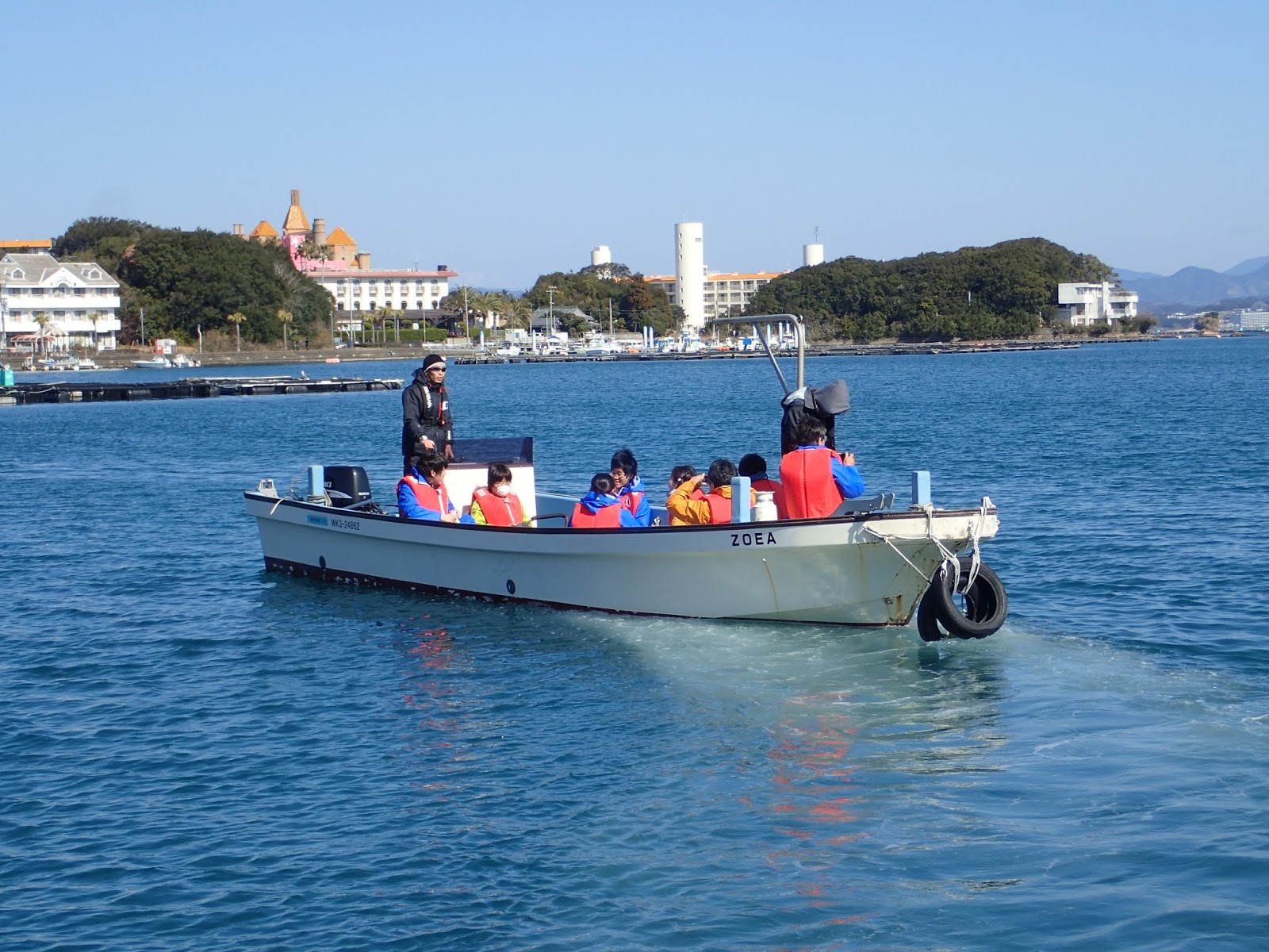 この日の実習は盛りだくさんです.朝の発表を終えてすぐに畠島へ渡り,海草と海浜植物の観察を行いました.写真は京大所有の実習船ゾエアです.