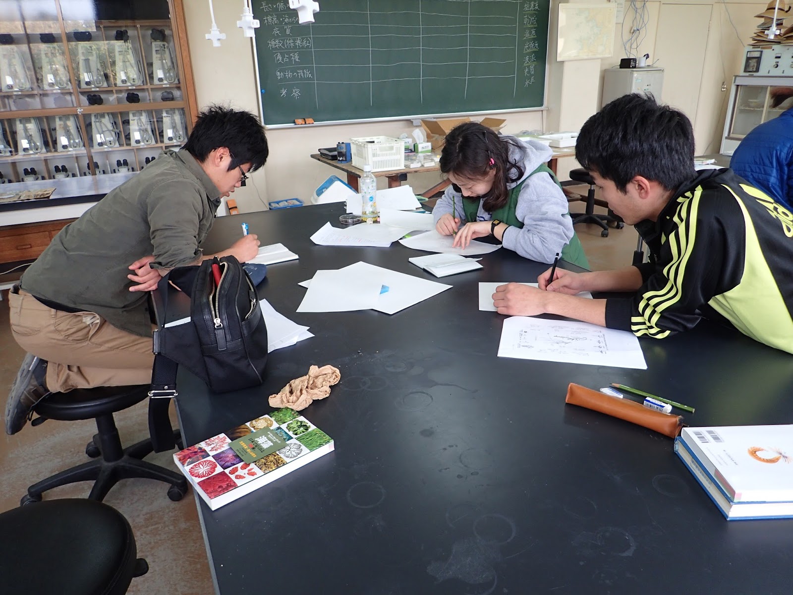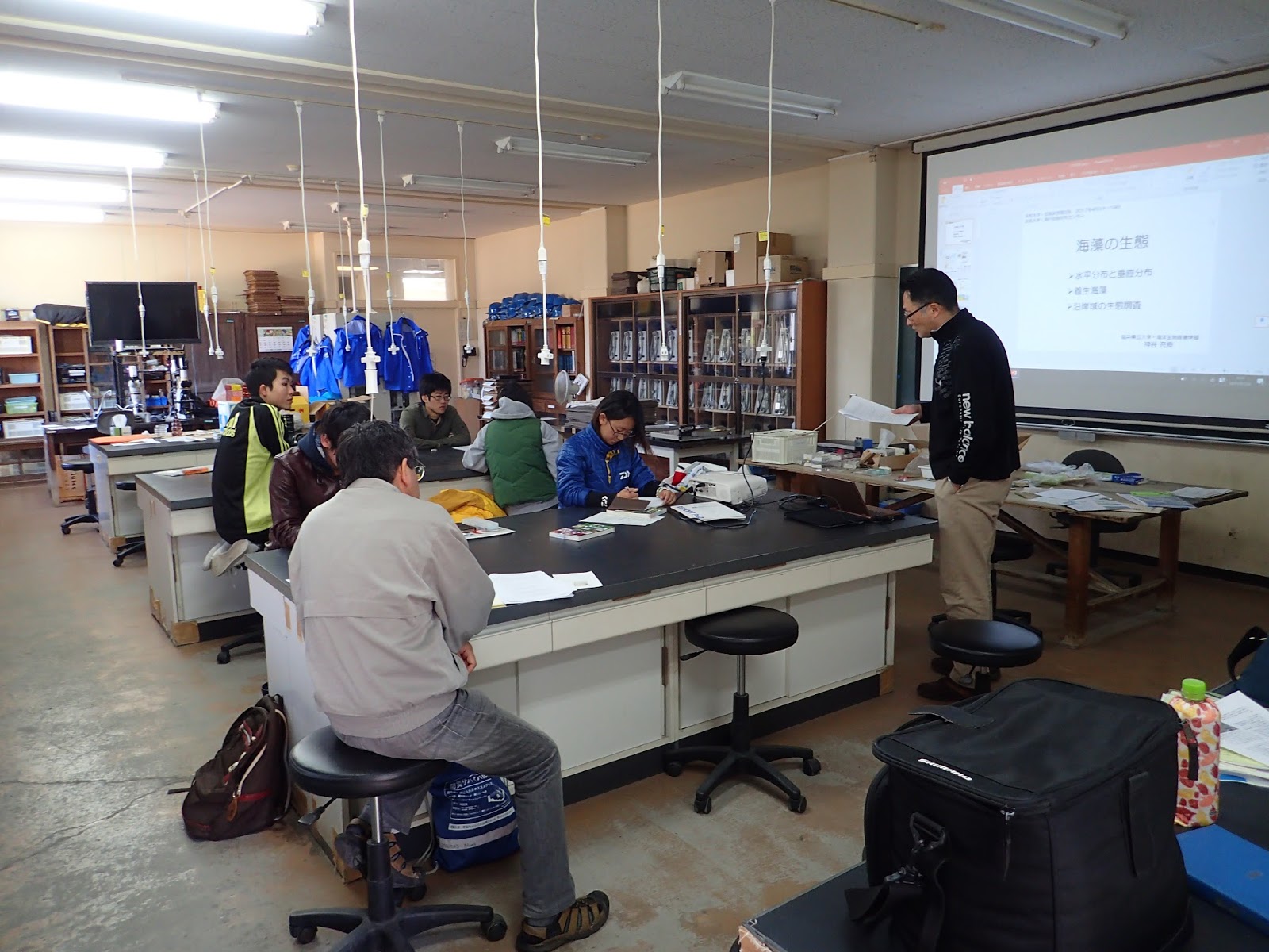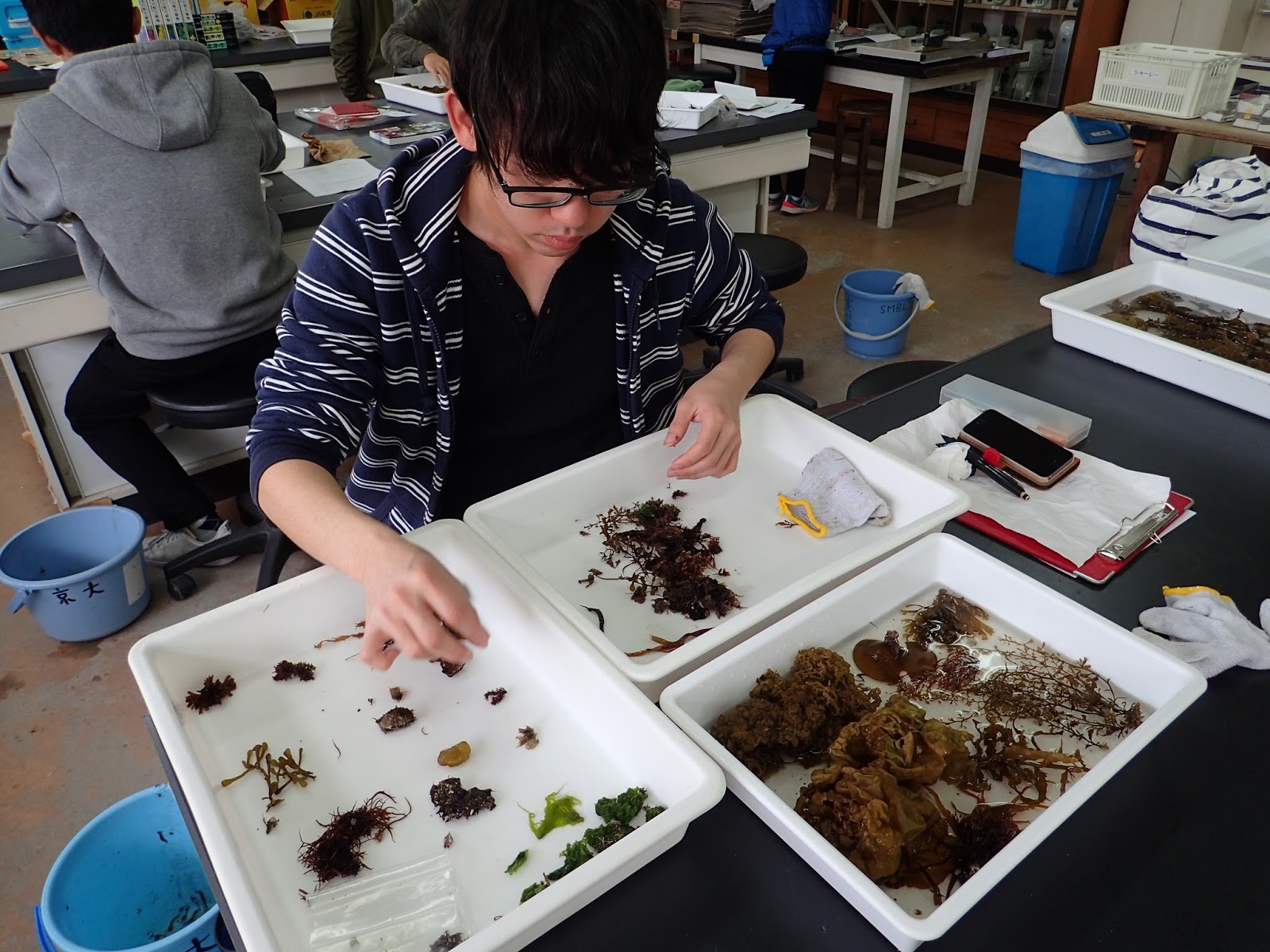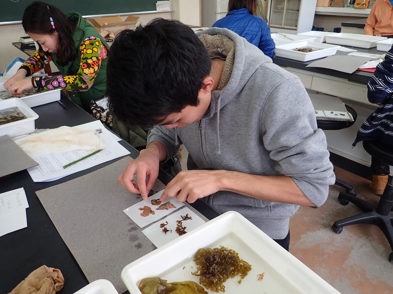 暖かいラボに戻ったら,採集した海藻の同定が始まります. 図鑑や採集時の解説を参考にして海藻の特徴を覚えてもらいます.