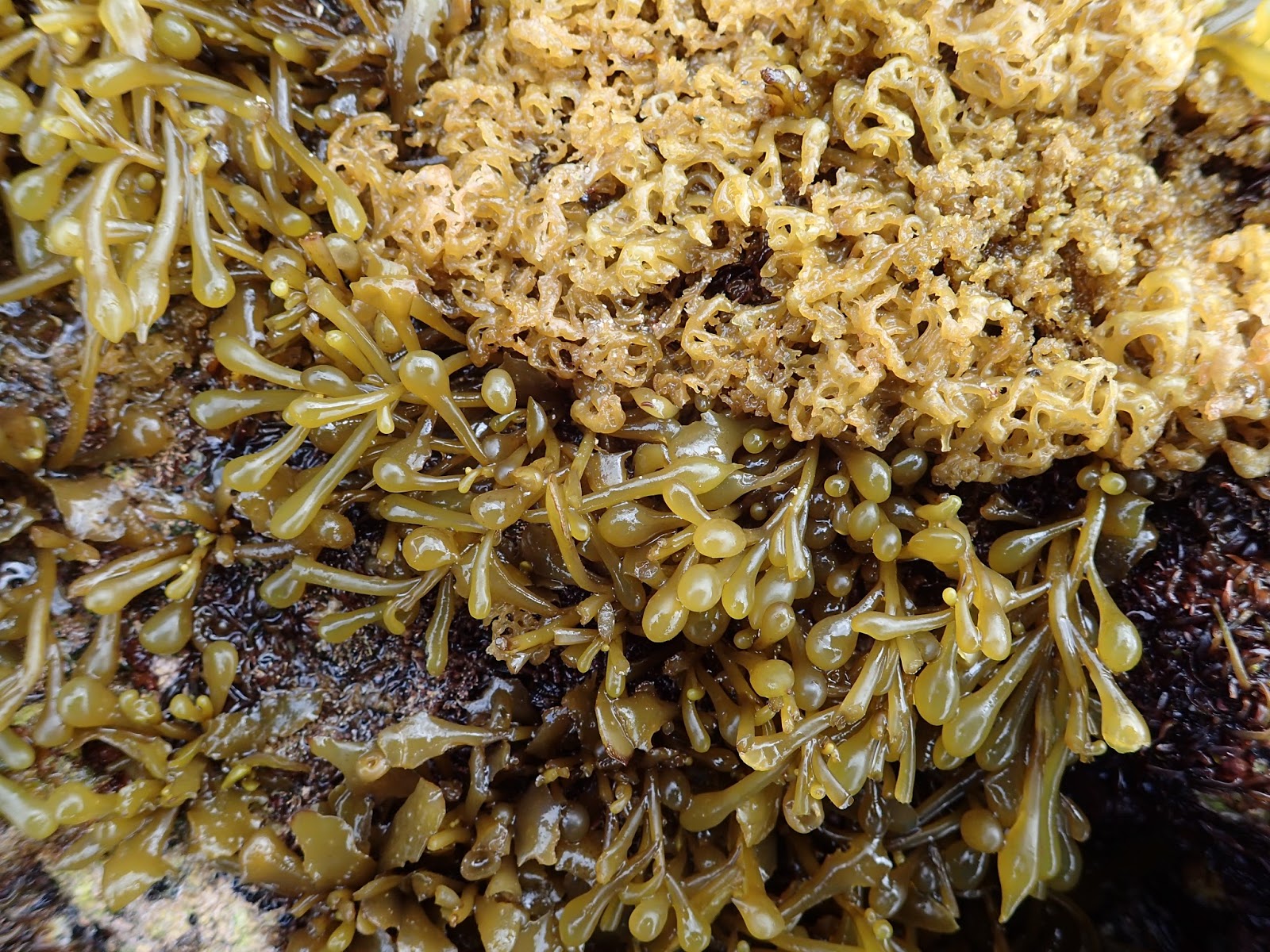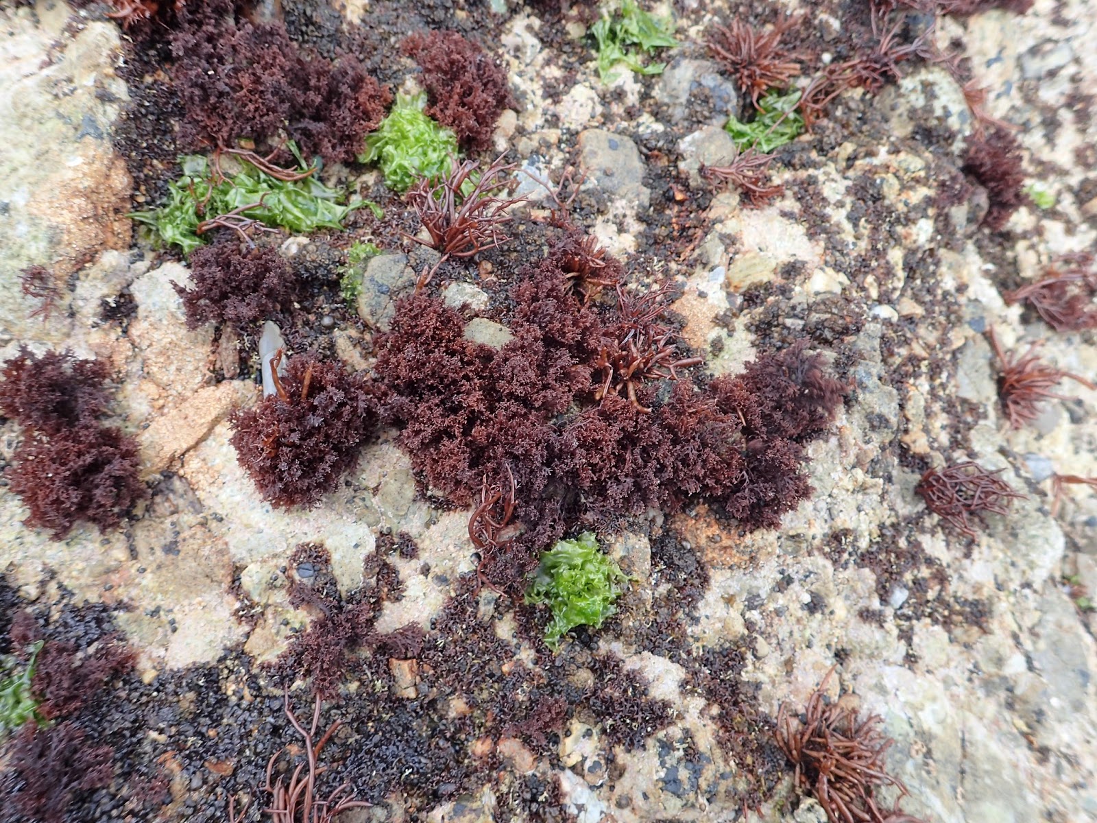 足下には,このような色とりどりの海藻が繁茂していました.左はハナフノリとフクロフノリ,右はカゴメノリとみなさんおなじみのヒジキです.