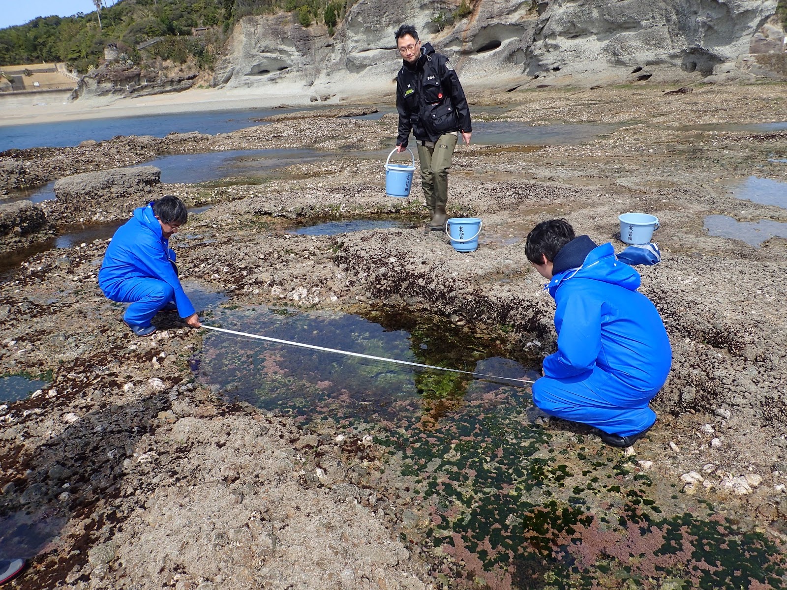 午後になり,いよいよタイドプール内の海藻分布調査が始まりました.調査するタイドプールの大きさや深さ,海面からの距離,方角など様々な要素によって生育する海藻の種類が変わってくるのです.