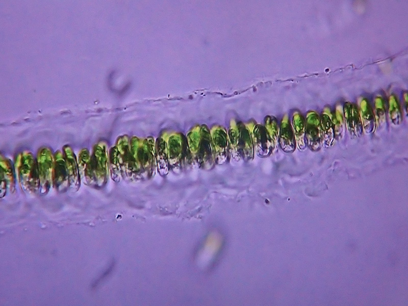 ガラスボールの縁にたまった緑色の部分です.それを拡大すると右の写真のようになります.これは遊走子といって鞭毛をつかって泳ぐことができます.遊走子が岩場や網に着底すると,新しいアオサへと成長していきます.