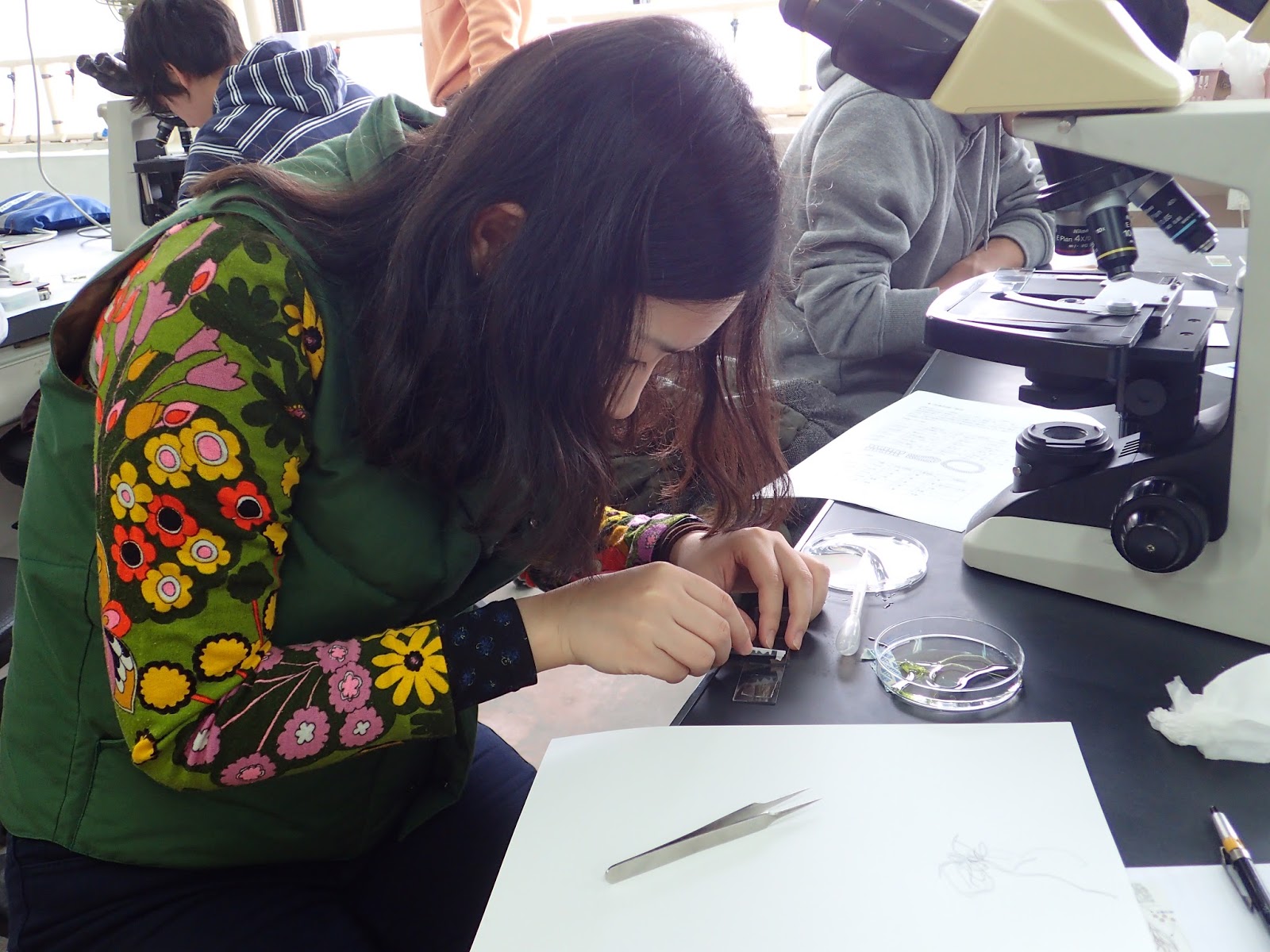 実習生もキレイな切片を作るべく,何度もチャレンジしていました.もちろん観察とスケッチも必要です.